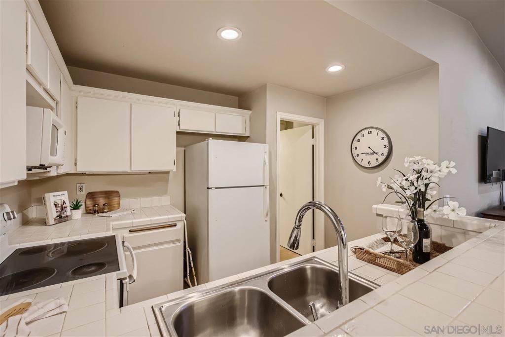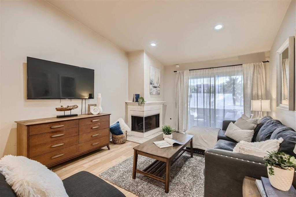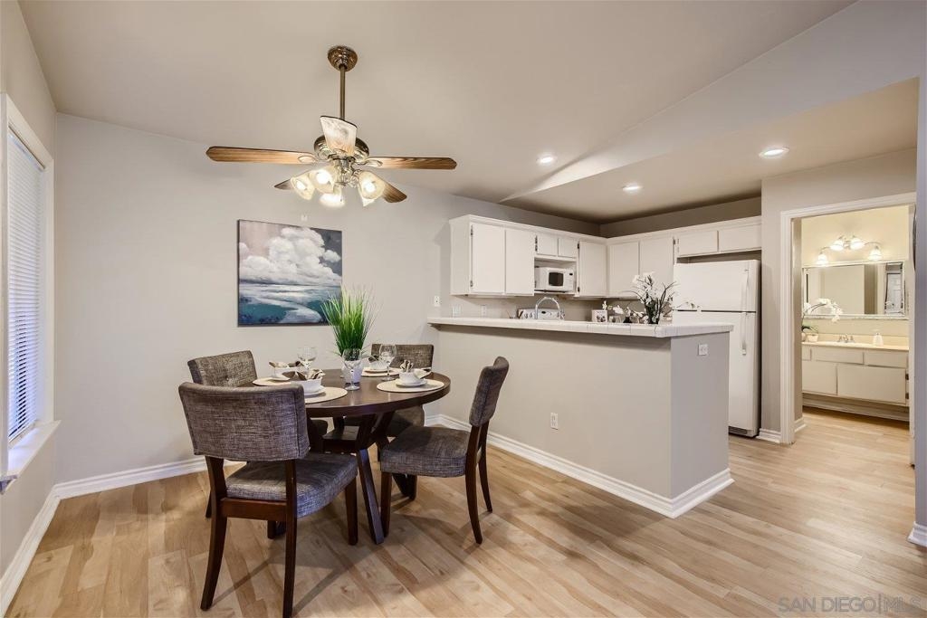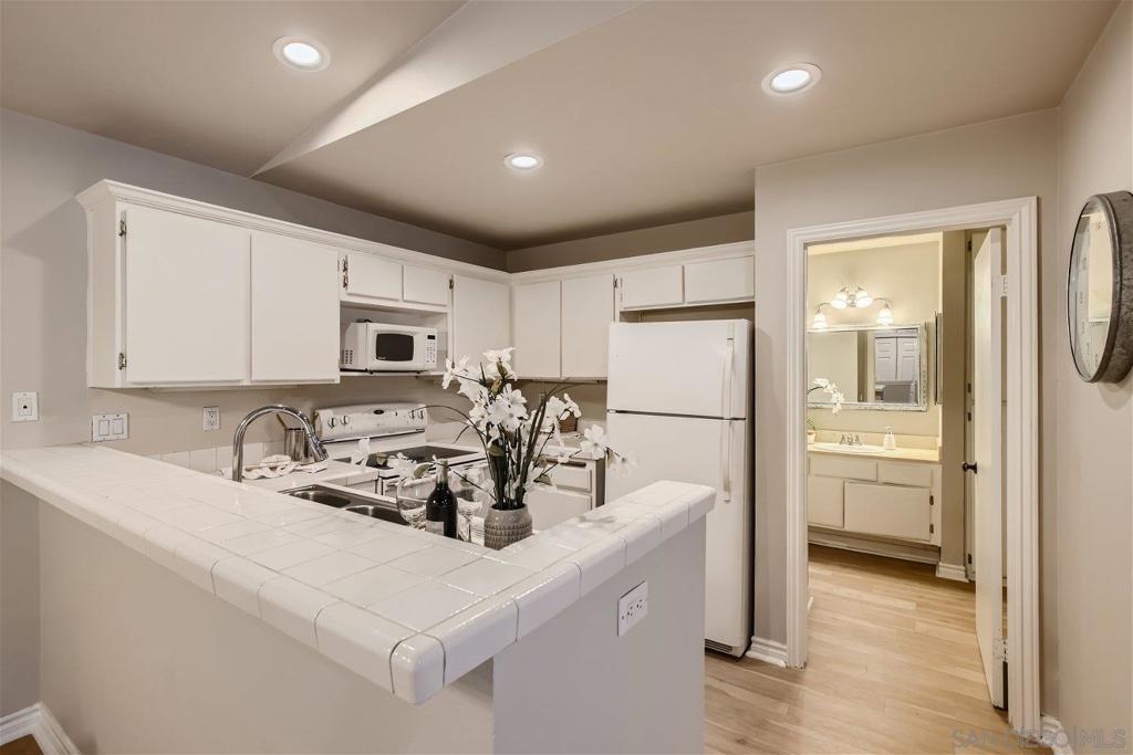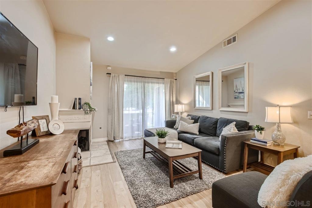 This single level corner unit features two en-suite bedrooms separated by the family room/kitchen combo, making it a versatile space for your needs.Enjoy the convenience of having no upstairs neighbors. The fireplace has been updated with designer encasing and molding. The unit has a patio for outdoor entertaining and a rear door for convenient grocery unloading. Located near Trader Joe's, Major Market, and Restaurants. This unit offers a comfortable and practical living experience in a convenient location.