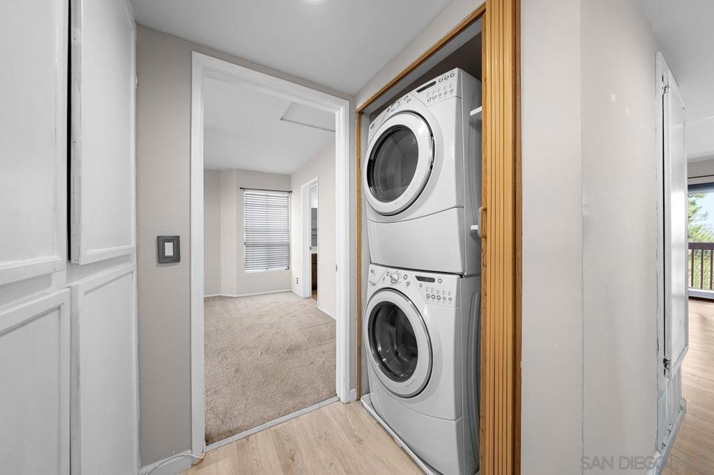 Best unit in complex! Nicely maintained and cared for upper floor two-bed, two bath condo in convenient Escondido location. Unit has tasteful laminate floors in living areas, built-in cabinets, two balconies, and a kitchen with recessed lighting, pop-out window over sink and with plenty of cabinet and counter space. Both bedrooms are carpeted with ample closets and ceiling fans. And no more shared laundry as this home comes with a stackable washer and dryer. Complex features assigned parking, pool, and rec room.