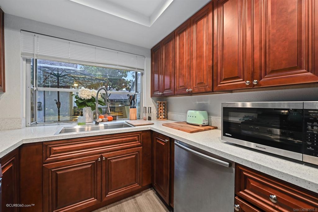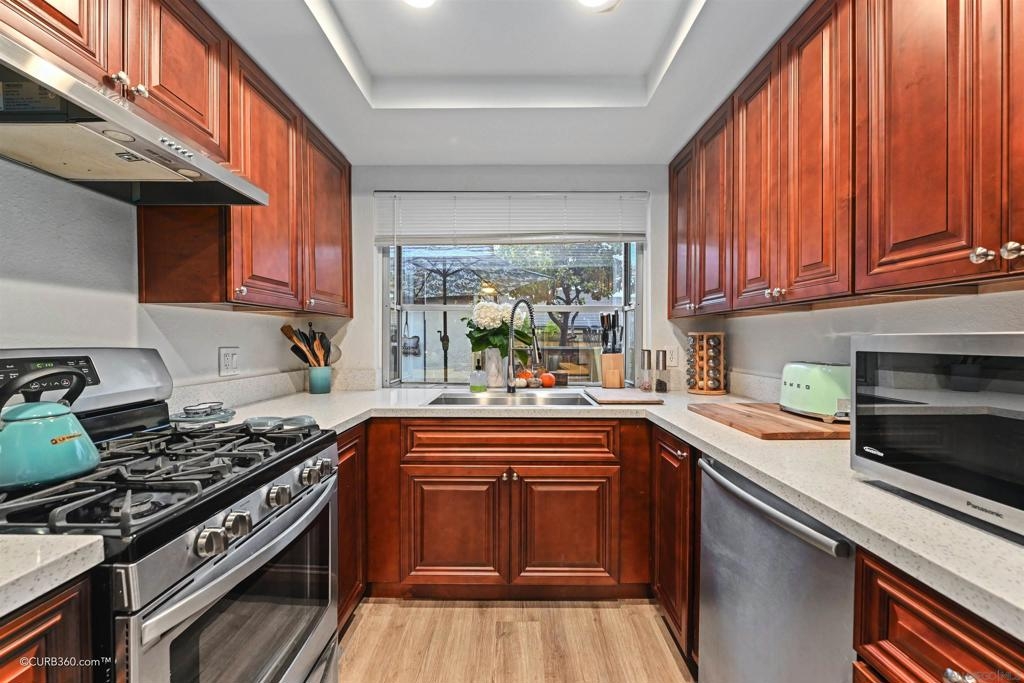 Welcome to the highly desired Cape Concord Community. This spacious two-bedroom 2 Full Bathroom Townhome feels like a detached home. The open-concept dining room and living room with high ceilings are perfect for entertaining. Prepare meals in this beautifully remodeled kitchen with stainless steel appliances, granite countertops, and new soft-close cabinets. This home features newer laminate flooring throughout and carpet in the bedrooms. The current owners have upgraded to a dual pane sliding patio door in the living room and have installed french doors with custom built-in privacy blinds in the Primary Bedroom. Both bathrooms are updated with newer vanities and tile floors. Enjoy your private backyard with plush turf, sustainable plants, and picturesque views of rolling hills. The front of the home features a gated patio with space for a bbq and a table for six guests, perfect for your morning coffee. The community offers a pool and clubhouse. This townhome is close to schools, shopping, and major freeways. Equipment: Range/Oven Sewer: Sewer Connected Topography: LL