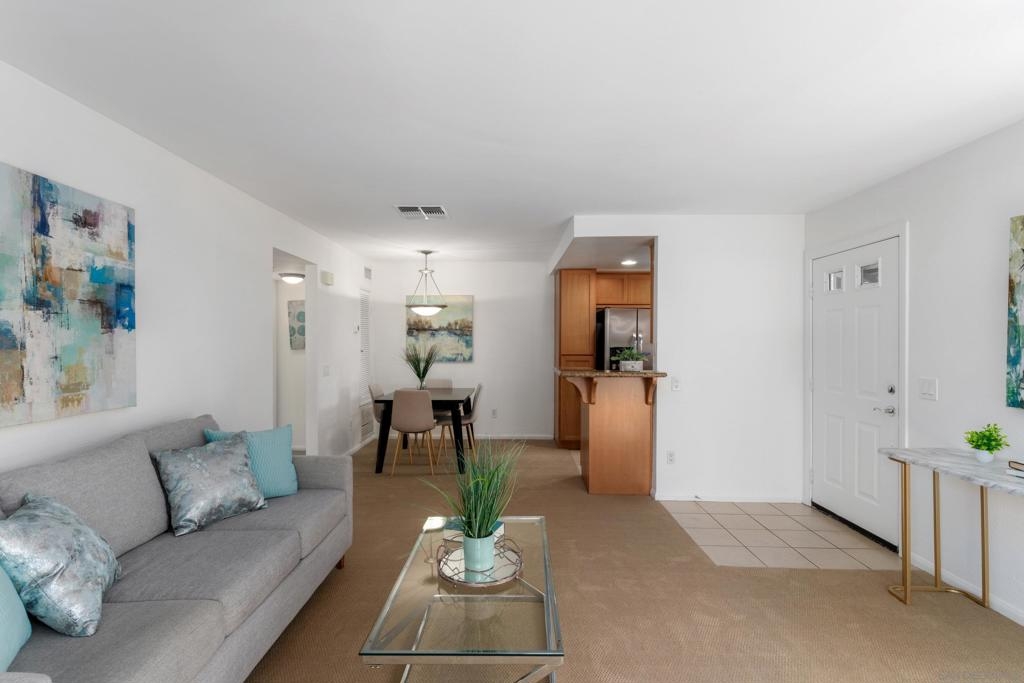 This one bedroom condo has all the features you're looking for. Updated with brand new carpet and fresh paint, the home highlights in-unit laundry, central heat/AC, vinyl dual pane windows, a spacious private patio, shaker cabinets, storage closet and large bedroom with walk-in closet. The kitchen features granite counters, stainless steel appliances, a pantry and ample cabinet space. The Heritage at Canyon Pointe community offers two pools and spas, a clubhouse with kitchen, gym, game room and is VA approved. This is a great home for personal use or rental income. Don't miss this opportunity!