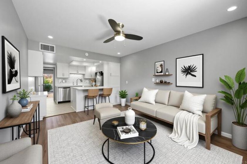 Turn-key, Highly Updated 1 bedroom/1 bath home in North Escondido. Expansive views of the Boulder Oaks Golf Course with lush grounds. This comfortable home features luxury Vinyl plank flooring throughout, upgraded open kitchen with Quartz countertops, bar seating and stainless steel appliances. Dual Pane windows and sliding door, Google Nest Smart Thermostat and newer paint. First floor unit is accessible from patio and front entry. Patios in front and back of the home to enjoy the open views. Assigned parking space by unit and ample overflow parking. Shopping, restaurants and freeway access nearby. Hidden Meadows is a beautiful community with rolling hills, hiking and beautiful views. Use of Hidden Meadows Community Pool and Tennis Courts for $330/year.