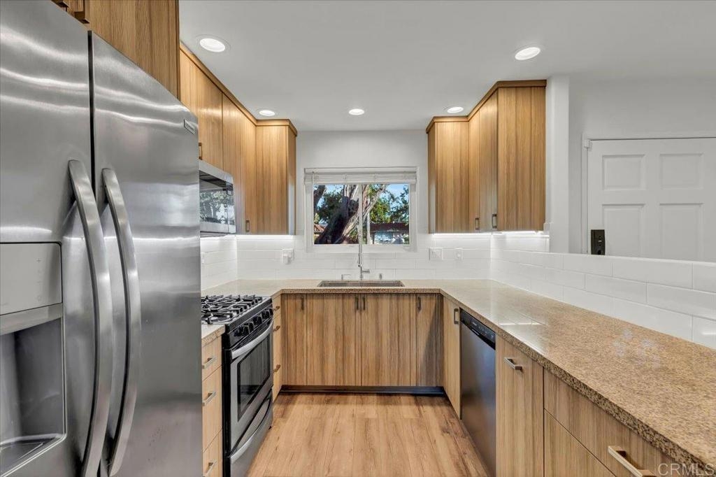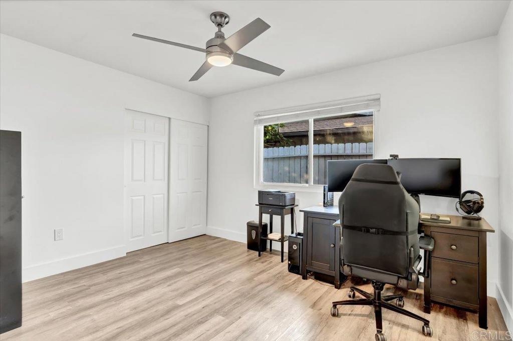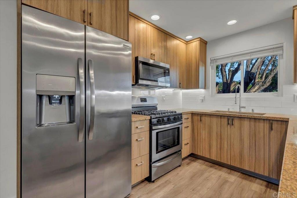 Welcome to this charming single-level home situated in the highly sought-after gated community of Holiday Gardens in Escondido. This beautifully renovated home features 2 bedrooms, 2 bathrooms, and over 1,000 sq ft of living space. Designed with an open floor plan, this home boasts a cozy fireplace and a private patio that leads directly to the sparkling pool and spa, enhancing your outdoor living experience. Upon entering, you're greeted by high-end Italian cabinetry, stainless steel appliances, granite countertops, and a chic subway tile backsplash in your contemporary kitchen. The bathrooms are elegantly designed with new floating vanities, LED mirrors that help add a touch of luxury & an 8-jet shower tower system in the primary bathroom. For added convenience, the home includes an in-unit washer and dryer, along with a detached shared garage space that offers additional storage. As if these upgrades weren’t enough, the new buyer will have energy-efficient windows and patio sliding doors that were installed just five years ago, along with a new HVAC system and an Ecobee smart thermostat, ensuring comfort and efficiency year-round. This home is perfectly located just minutes from downtown Escondido, with easy access to shopping, dining, top-rated schools, parks, weekly car shows, farmers markets, & more. Interstate 15, Highway 78, easily accessible. It offers the perfect blend of comfort and convenience. Don't miss your opportunity to make it yours!