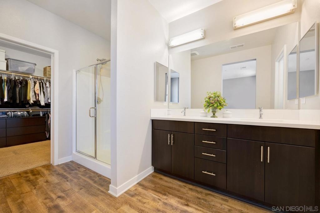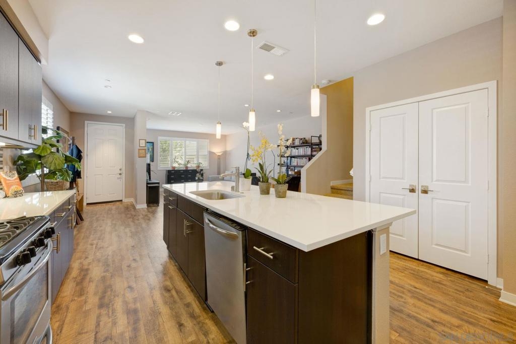 Rare 2 story home in the newer Level 15 community of Escondido! Very close to the freeway, this highly upgraded end unit is the largest model available with its 3 bedrooms and a loft that can be used as an office, living space or converted into another bedroom. Beautiful quartz countertops, dark modern kitchen cabinets, luxury vinyl flooring throughout the first level and upgraded carpet on the second level. Spacious master bedroom with a beautiful en suite bathroom and a large walk-in closet. The laundry room also has a sink for maximum convenience. All windows have the upgraded white farmhouse shutters. This end unit only shares one wall, has privacy and lots of windows throughout for plenty of sunlight! While the front patio is ready for a bbq and a lounge set up, the attached 2-car garage in the back provides your much needed storage space. Built in 2016 this home still looks brand new and definitely move-in ready! Refrigerator, Washer and Dryer not to convey Sewer: Sewer Connected