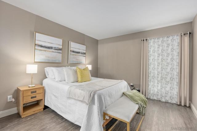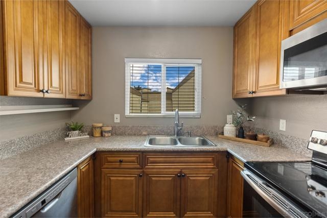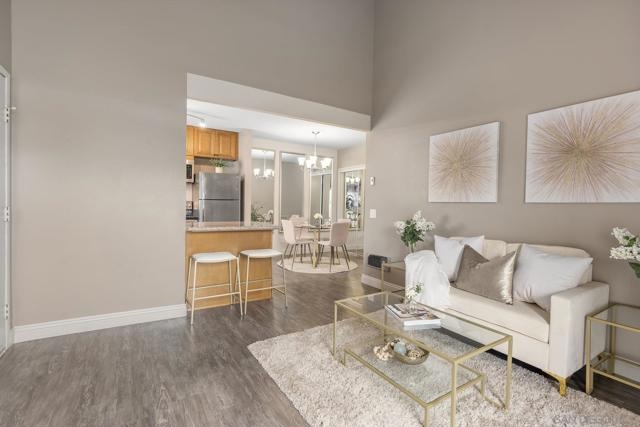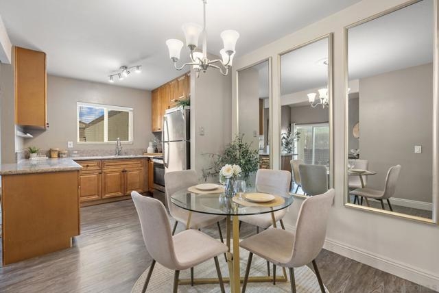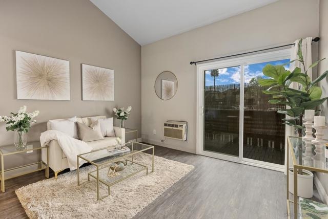 This stunning two bedroom, one bath condo is a gem that you don't want to miss out on! The living room boasts a beautiful vaulted ceiling that creates an open and spacious feel, perfect for entertaining guests or relaxing after a long day. The kitchen is equipped with stainless steel appliances and gorgeous granite countertops, making meal prep a breeze. The bar-style seating is perfect for quick meals or catching up with friends over drinks. The condo features grey laminate flooring throughout, giving it a modern and chic feel. The Jack and Jill bathroom is both stylish and functional, featuring a convenient cosmetics vanity and ample storage space. You can enjoy the comfort of newer vinyl windows that let in natural light while keeping the elements out. Residents of this community have access to a sparkling pool and spa, perfect for soaking up the California sunshine. This property is well-maintained and move-in ready. Don't miss your chance to make it your own!