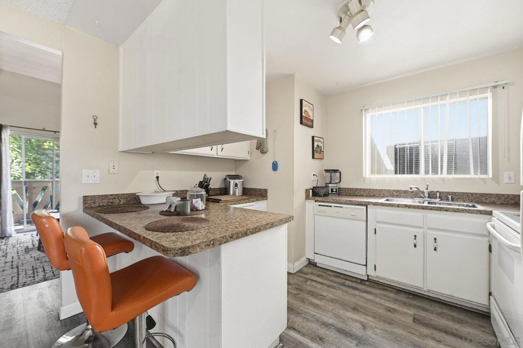 Value Range $350,000–$375,000. Welcome to this light and bright upstairs condo in the heart of Escondido featuring white-painted wood-beam ceilings and an open, airy layout. The spacious living room offers wood-laminate flooring, a gas fireplace with mantle, and a wall-mounted AC unit for year-round comfort. A sliding glass door opens to a private balcony, perfect for relaxing or entertaining. The adjoining dining area features a ceiling fan and connects seamlessly to an upgraded kitchen with attractive countertops, a dishwasher, and a convenient breakfast-bar design. The open-concept layout provides an inviting flow between the living and dining spaces, creating a warm and functional atmosphere. The hallway continues with wood-laminate flooring and includes a full-size laundry closet with side-by-side hookups. The bathroom offers tile flooring, modern lighting, updated fixtures, and tasteful finishes, while the master suite includes crown molding, a ceiling fan, mirrored closet doors for ample storage, and a private half bath with toilet and sink. Enjoy the fresh air from your private balcony which includes a convenient storage closet. This upper-level unit also includes two assigned parking spaces, both numbered #6—one covered and one uncovered—for easy access. The community features a sparkling pool and a relaxed setting close to shopping, dining, and major freeways. An excellent investment opportunity, this property currently has long-term tenants in place who would love to stay and are paying $2,500 per month.