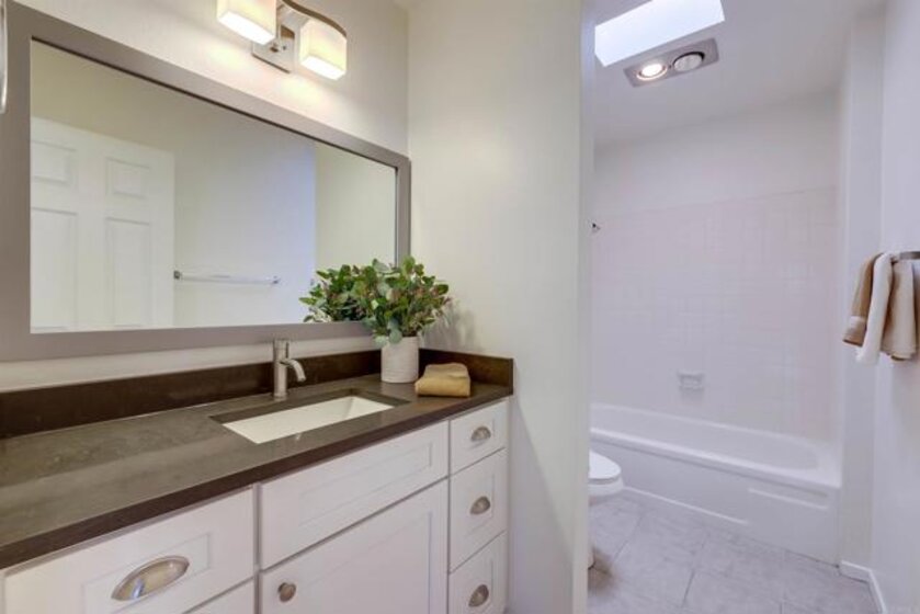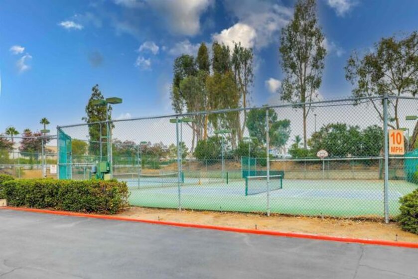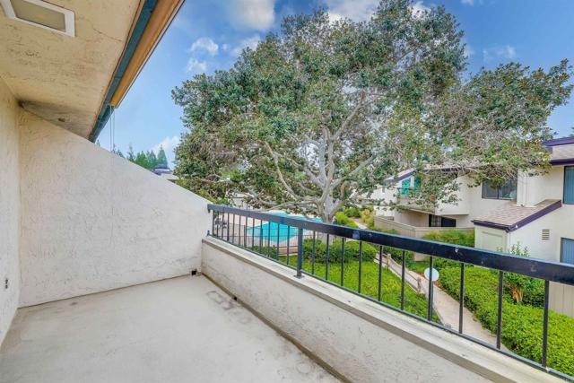Beautifully remodeled, clean and light. New cabinets, counter tops, & stainless appliances in kitchen and both baths. New window blinds. Central air. Fireplace. Mirrored closet doors, double sized closet in master. Desirable, gated Vermont Villas. Quiet interior location. Spacious room sizes. Large open living room and kitchen. End unit with lots of windows and skylights. Private deck with views of the pool and green spaces. Full sized laundry with washer & dryer included. Sparkling community pool & spa. Tennis, pickleball & sports court. Private access gate to shopping center. Fabulous south Escondido location near Vons, Major Market, Trader Joes, Sprouts, CVS, Rite Aid, Walgreens, restaurants and many more. Close to Kit Carson Park & North County Mall. Assigned 1 carport space & 1 uncovered space. Ample guest parking. Upstairs unit.