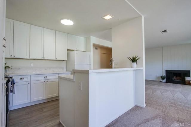 Beautifully remodeled, light, bright, open floor plan, spacious single story, ground floor unit. End unit with large private tiled patio. Move-in ready. Brand new cabinets, countertops, sinks, and stainless-steel stove, oven, microwave & dishwasher. New carpet in bedrooms, living room and dining room, new luxury vinyl planking in kitchen and hallways. Central heat and A/C. Two large bedrooms and two full baths. Double mirrored closet in primary bedroom. Large, mirrored closet in secondary bedroom. Laundry room. Fireplace in living room. large square footage for a 2 bedroom. Highly desirable complex features open areas with beautiful landscaping, sparkling community pool, spa, sports courts for basketball, pickleball & tennis, and is fully gated. Private access gate to shopping center. Close to Vons, Major Market, Sprouts, Trader Joes, CVS, Walgreens and restaurants. 2 Assigned parking spaces, one carport with large storage cupboard & one uncovered space. Ample guest parking. Solid double wall construction. Ideal location in beautiful South Escondido. Between S. Escondido Blvd. & Center City Parkway