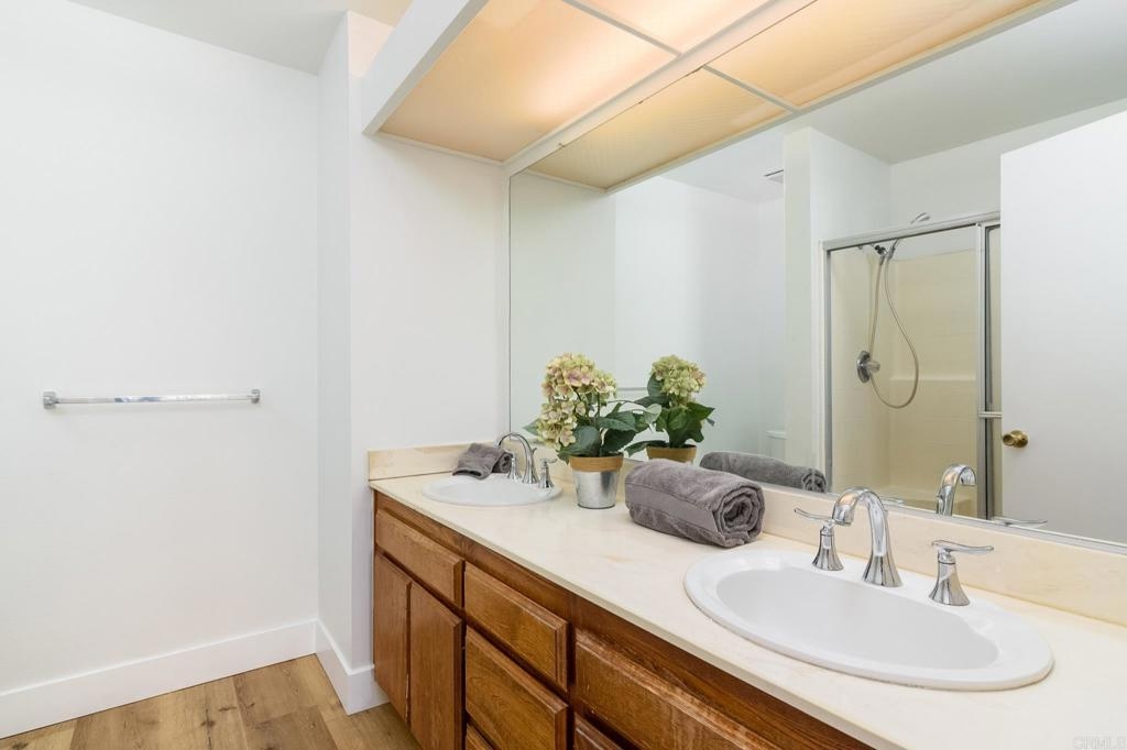 Located in the gated Villa Espanas Townhomes community, this 2 bed 2.5 bath home has just been updated and is move-in ready! Step inside and discover a spacious, welcoming interior that offers the perfect blend of comfort, style and room. Inside, the home showcases fresh paint & brand new luxury vinyl plank flooring throughout as well as central heat/AC and stainless steel kitchen appliances including a brand new dishwasher, range fan & 5-burner range w/ a Smart control WiFi/voice enabled oven. Downstairs, the functional layout includes a formal living/dining area, a powder bath, a full size in-unit laundry closet and a bonus room that can be used as a breakfast area or family room/second living space. Both bedrooms are privately located upstairs and boast high vaulted ceilings, wall-wide mirrored closet doors and their own en-suite bathrooms, with the master including dual sinks. Sit back & relax in the home's newly re-finished, spacious private patio that offers both sun & shade and opens to the detached garage allowing for easy access. The unit also offers an additional assigned parking space and is conveniently located just a few steps away from one of the community pools while being just far enough away to still enjoy privacy. The community amenities are equally impressive, with 2 sparkling pools, a relaxing spa, and a clubhouse for all your entertainment needs. Don't miss this opportunity!