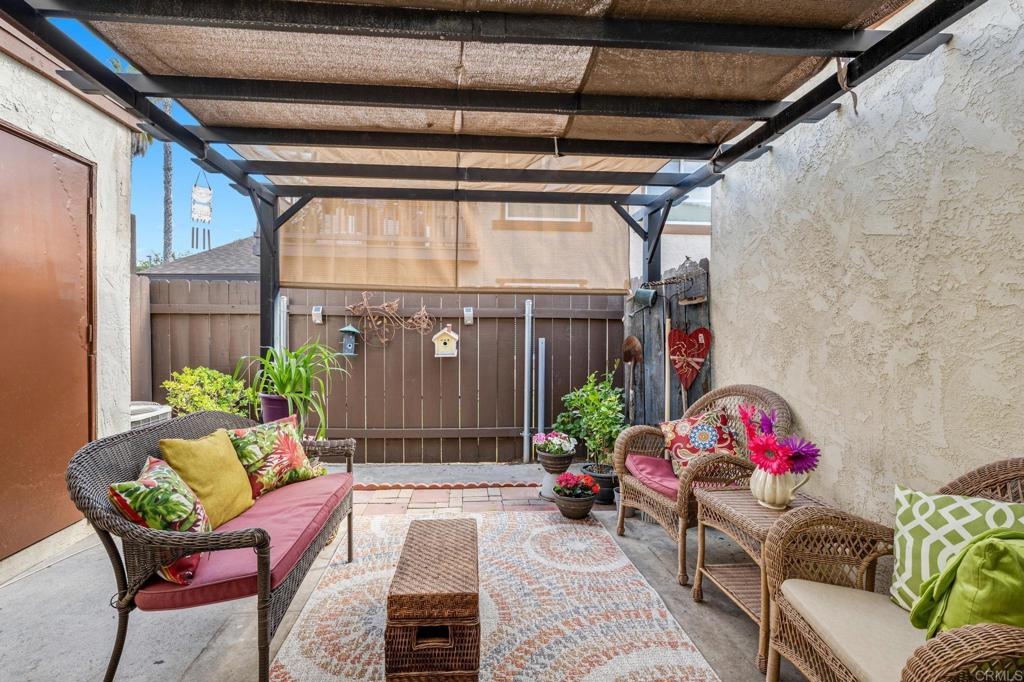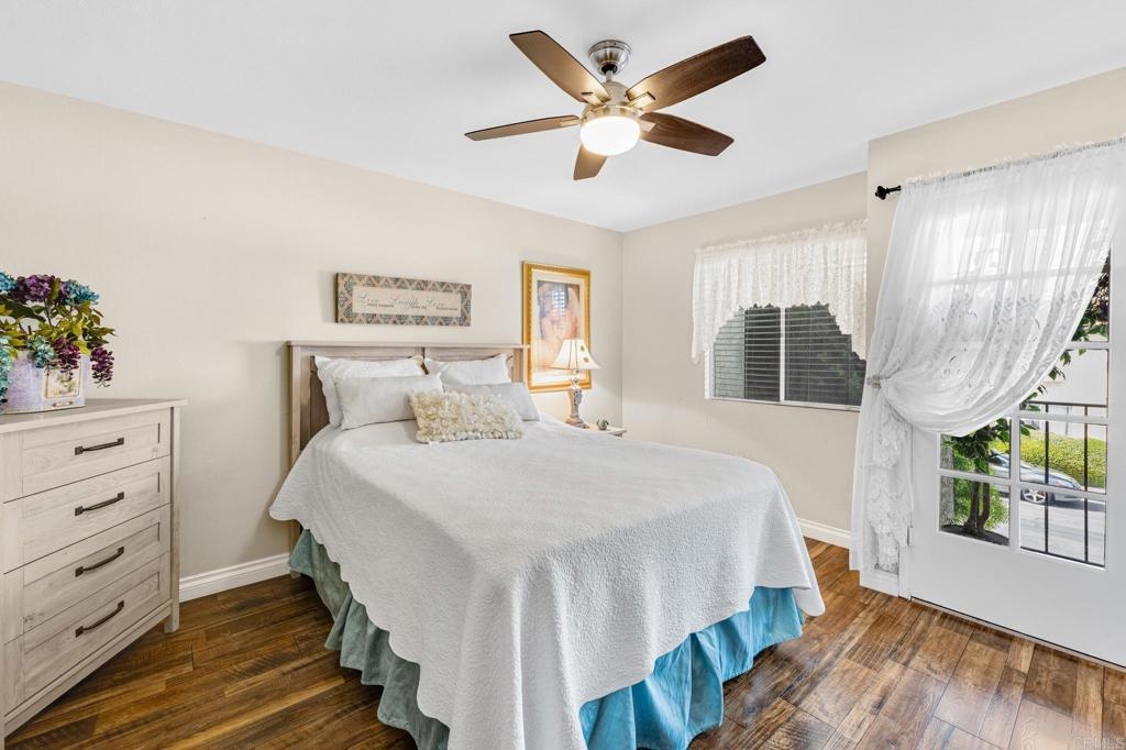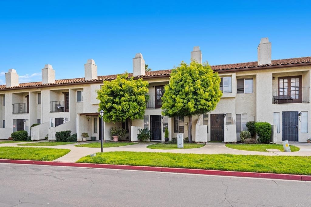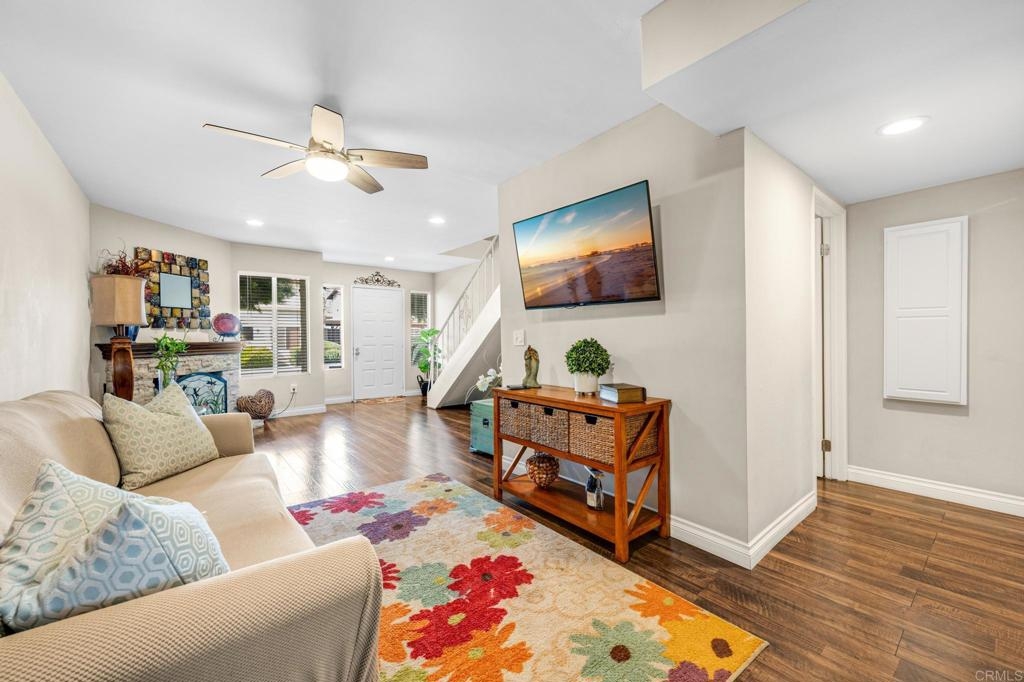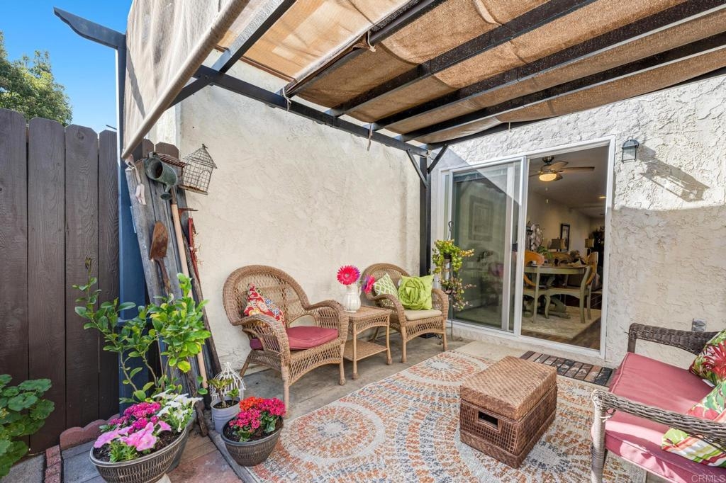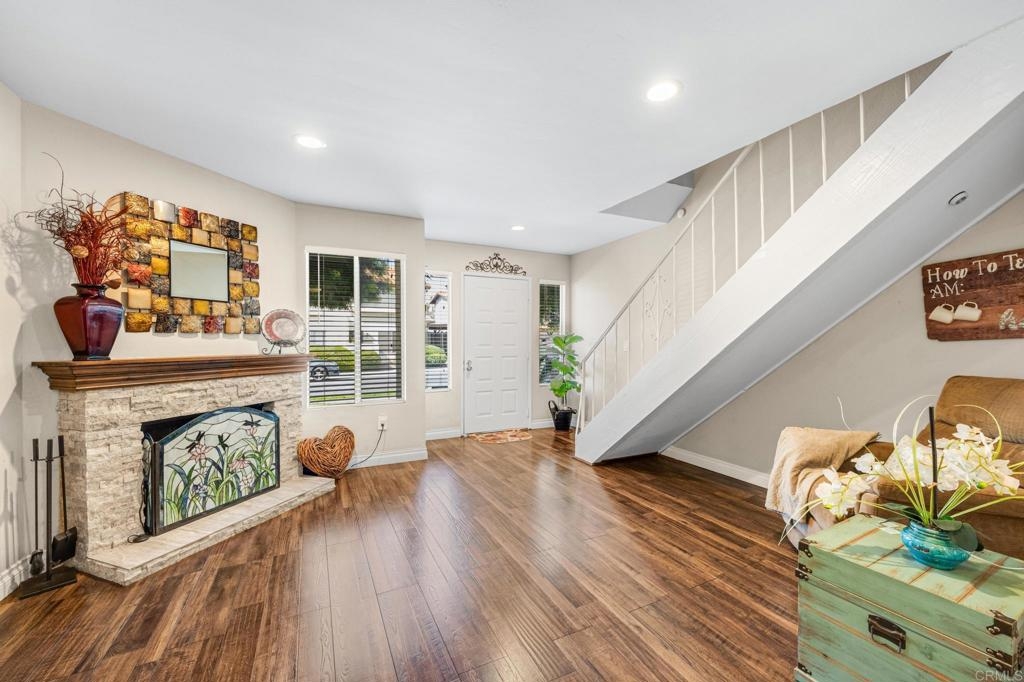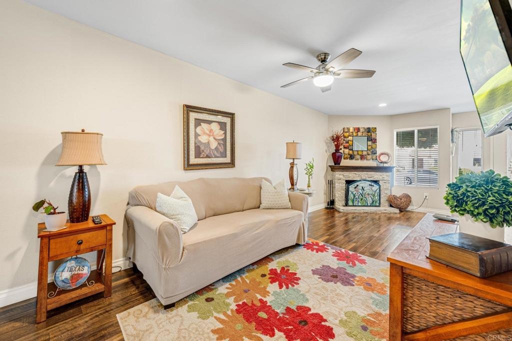 BEAUTIFUL condominium in a quiet gated community! Enjoy privacy in the serene garden patio in this highly desirable unit. This home is light and bright 2 bed/1.5 bath in the popular Villa Espanas community. The spacious home is upgraded with hardwood flooring, a gorgeous stone fireplace, and a remodeled bathroom! The large eat-in kitchen features white cabinetry, granite countertops, stainless steel appliances, and a custom pantry. The dining area has convenient sliding doors leading to the private patio, perfect for entertaining. Both bedrooms are upstairs and share the remodeled bathroom with double vanities and large, custom tiled shower. The home has 2 parking spaces (one covered carport and one space), A/C, and ceiling fans. Villa Espanas is a quiet gated community centrally located close to freeways and shopping and features a large pool/spa community area.