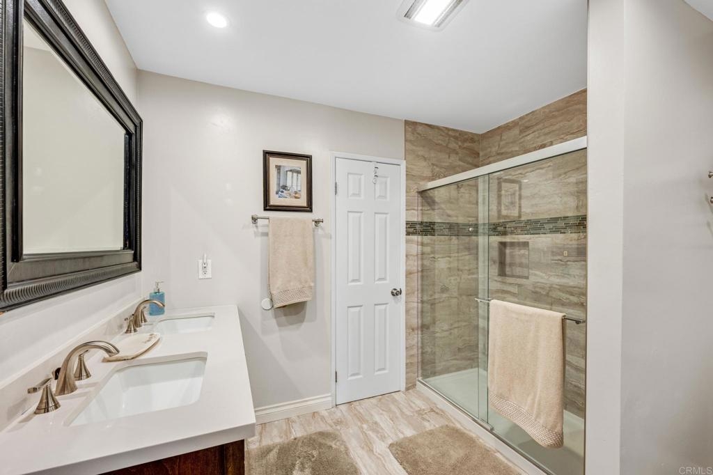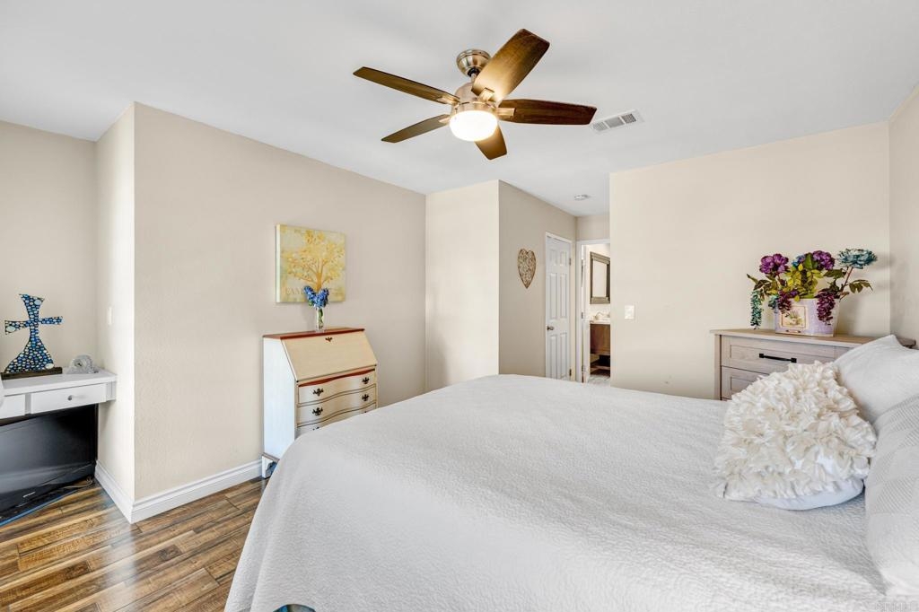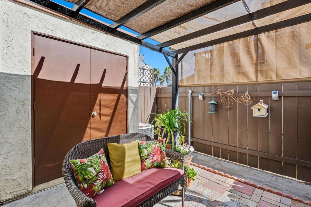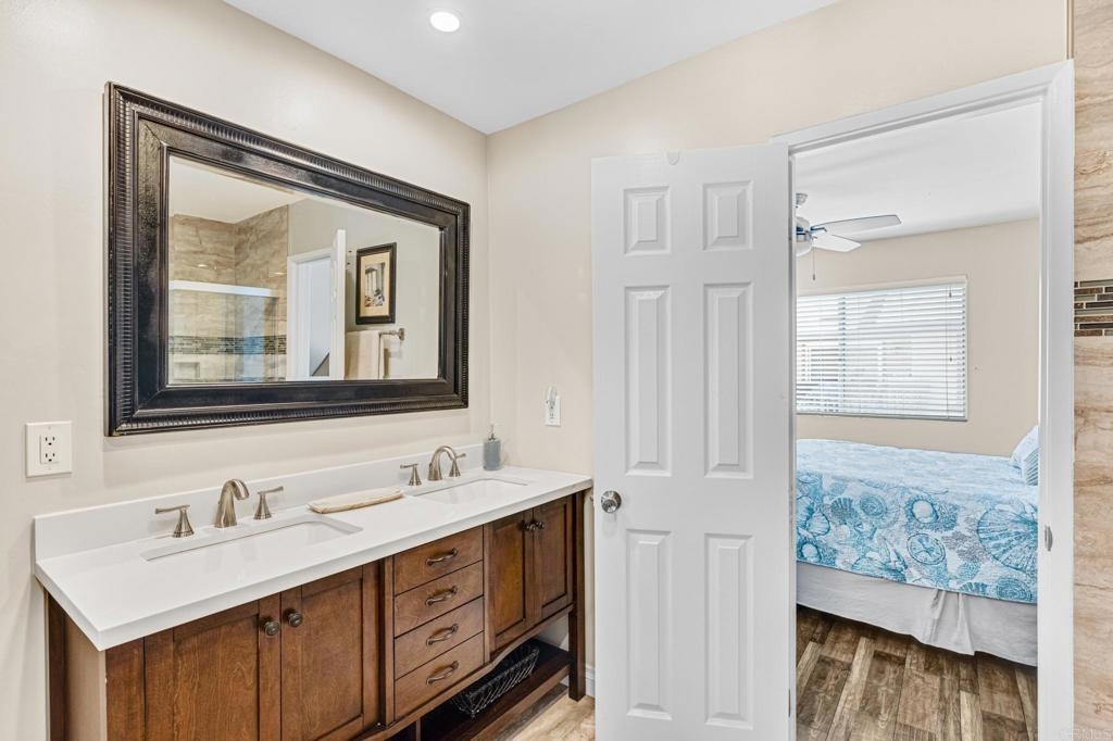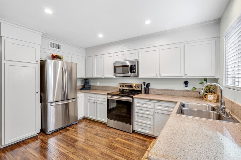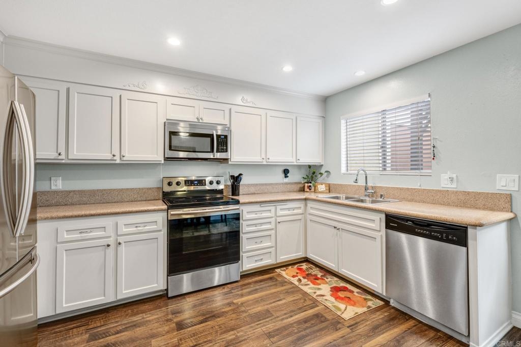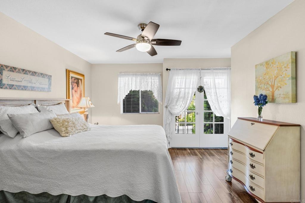 BEAUTIFUL condominium in a quiet gated community! Enjoy privacy in the serene garden patio in this highly desirable unit. This home is light and bright 2 bed/1.5 bath in the popular Villa Espanas community. The spacious home is upgraded with hardwood flooring, a gorgeous stone fireplace, and a remodeled bathroom! The large eat-in kitchen features white cabinetry, granite countertops, stainless steel appliances, and a custom pantry. The dining area has convenient sliding doors leading to the private patio, perfect for entertaining. Both bedrooms are upstairs and share the remodeled bathroom with double vanities and large, custom tiled shower. The home has 2 parking spaces (one covered carport and one space), A/C, and ceiling fans. Villa Espanas is a quiet gated community centrally located close to freeways and shopping and features a large pool/spa community area.