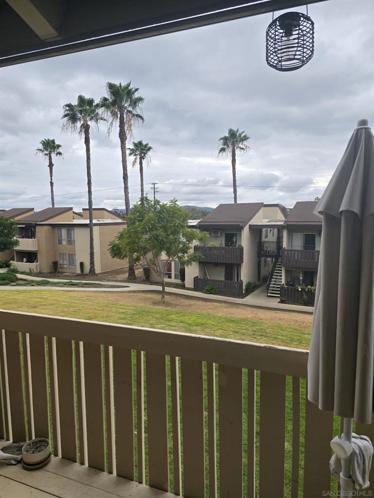 Value Range $325,000-$350,000. This light-filled two-bedroom, one-bath condominium offers a welcoming layout with vaulted ceilings accented by exposed wood beams and attractive wood laminate flooring throughout the main living area. The living room connects to the kitchen through a pass-through opening above the breakfast bar, creating a functional flow while maintaining defined spaces. Sliding doors lead to a private balcony with greenbelt views and peek mountain views, along with an exterior storage closet. The kitchen features tile flooring, upgraded cabinetry, Formica countertops, and dual sinks, with the adjacent dining area highlighted by a ceiling fan with light. Both bedrooms offer abundant natural light and mirrored closet doors, overlooking the greenbelt with peek mountain views. The primary bedroom includes washer and dryer hookups (washer and dryer not included) and additional storage. The Jack-and-Jill bathroom, accessible from both the primary bedroom and hallway, features tile flooring and a tub/shower combination. The community offers a pool and tennis courts, and the property is conveniently located close to shopping and everyday amenities, with easy access to surrounding services and lifestyle needs.