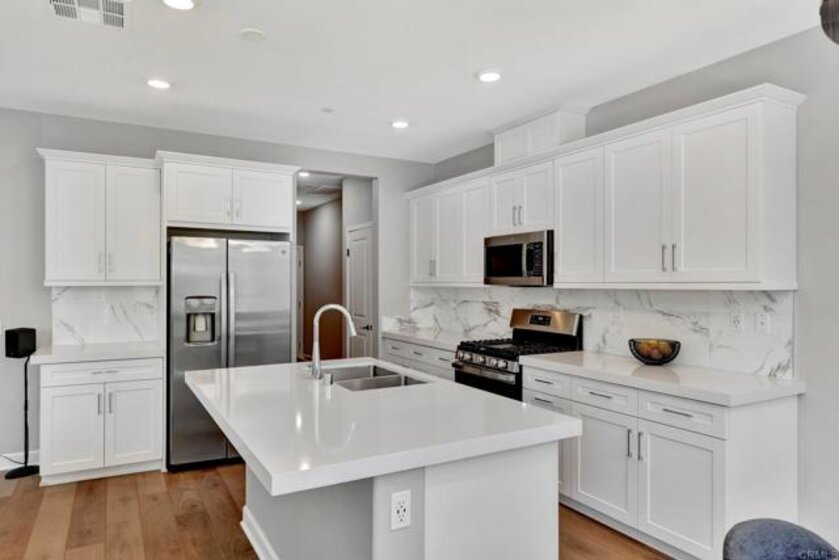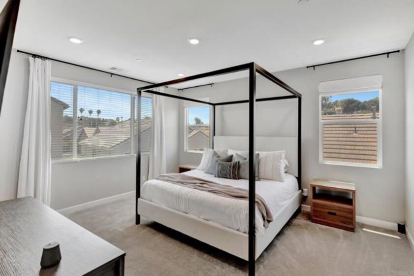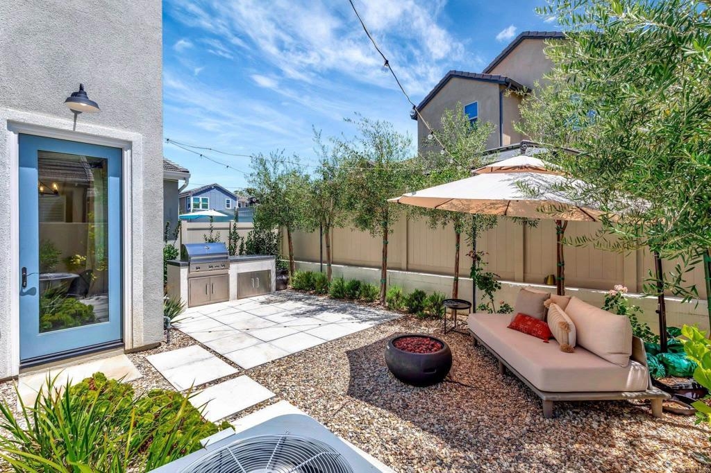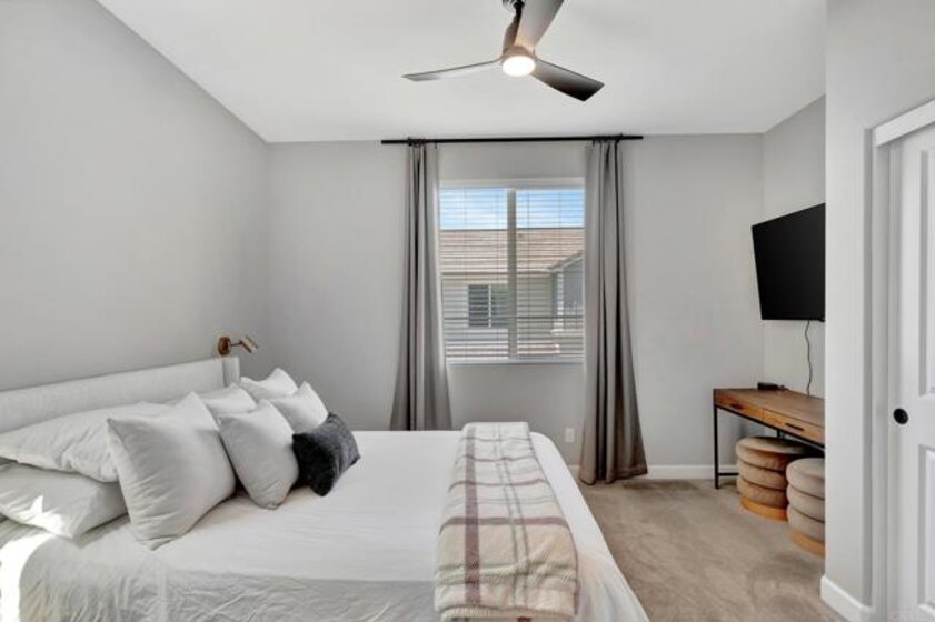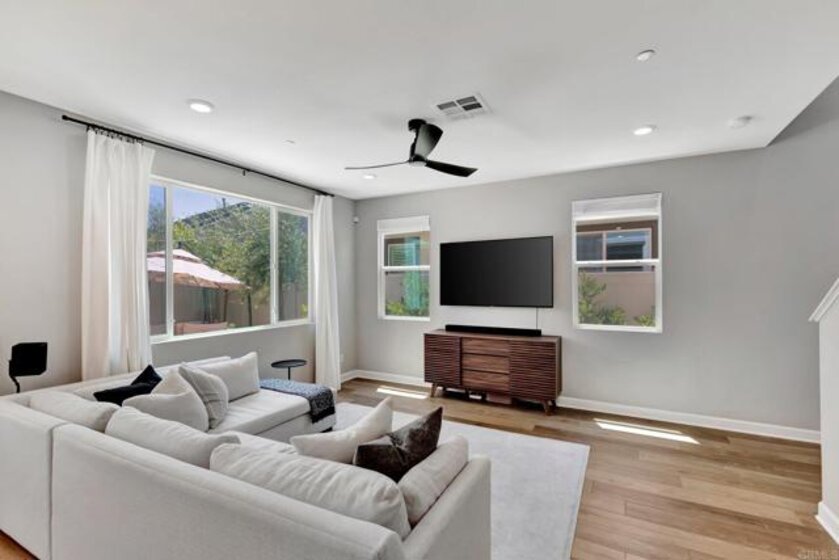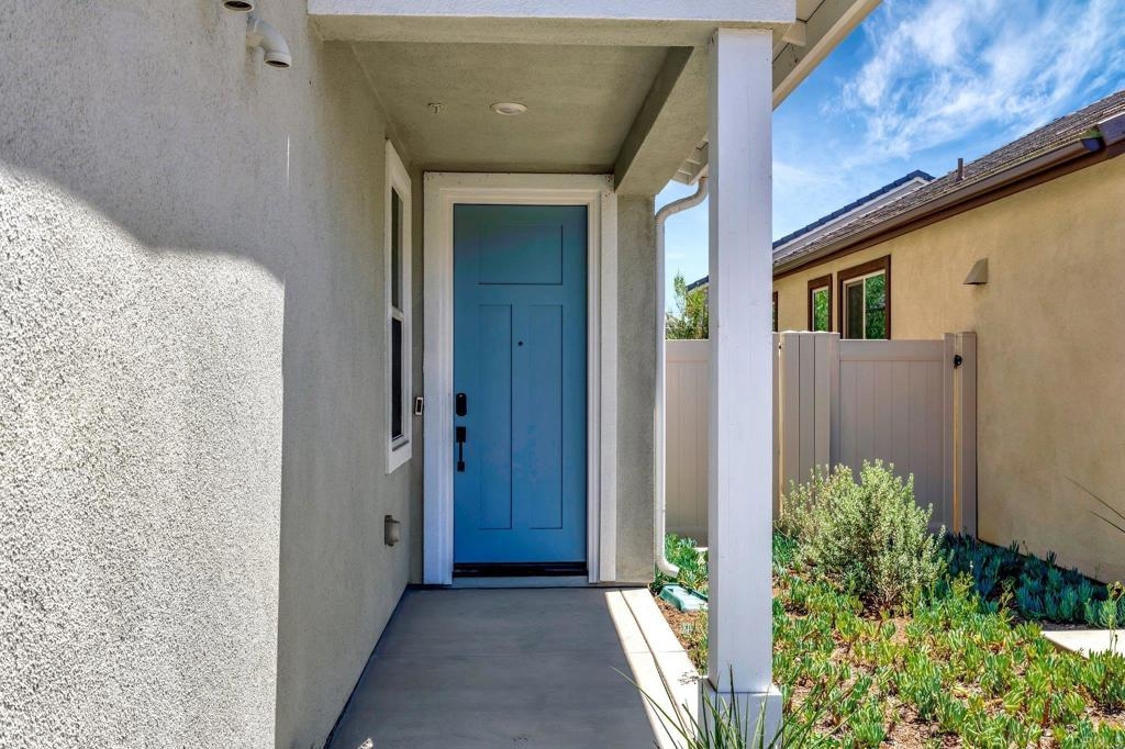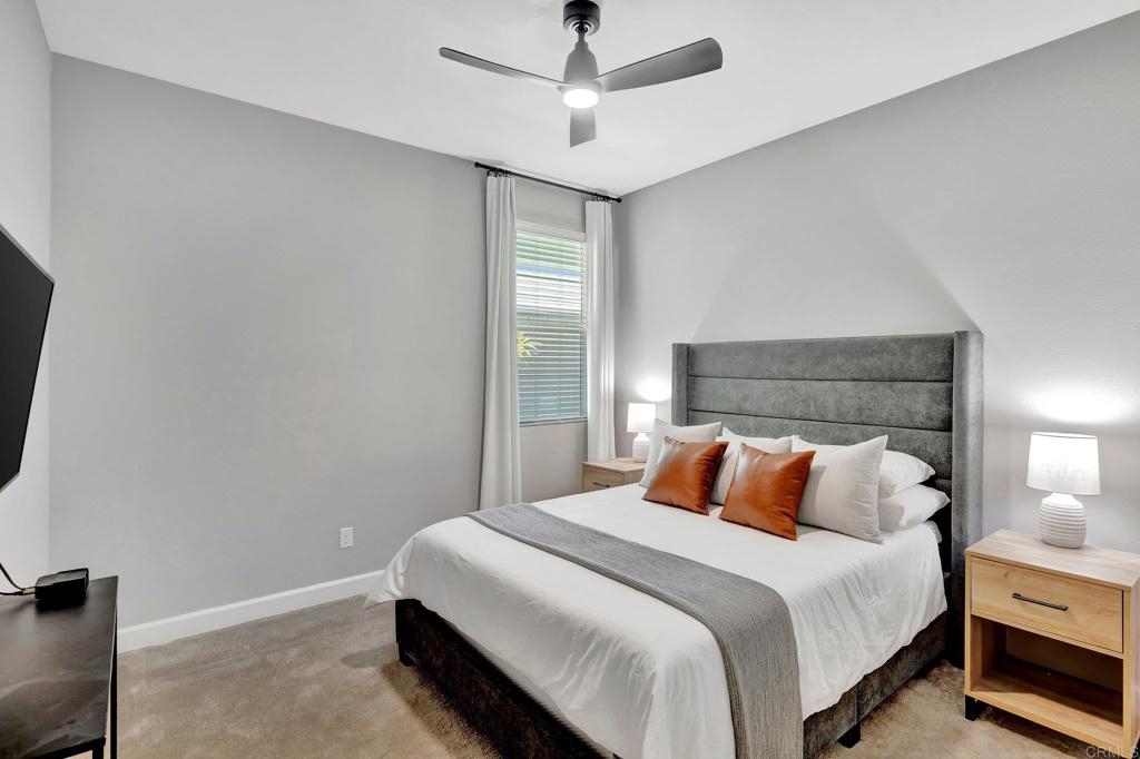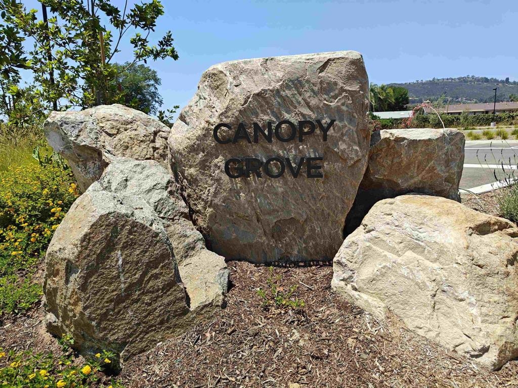 Pristine Retreat neighborhood home in newly developed Canopy Grove. Home features 4 bedrooms, 3 bathrooms, first level bedroom and full bathroom, upgraded flooring, quartz counters, solar, tankless water heater, and built-in barbeque. The kitchen features a quartz island w/ seating, quartz countertops w/ full tile backsplash, upgraded flooring, stainless steel appliances, pantry, pull out trash receptacles, and recessed lighting. The family room offers upgraded flooring, recessed lighting, a ceiling fan, and opens to the kitchen creating a large open living space. Adjacent to the kitchen, the breakfast area is enhanced w/ a chandelier and a glass door that leads to the backyard. The first level bedroom includes a ceiling fan and a walk in closet. The first level bathroom features upgraded flooring, a glass-enclosed walk-in shower, and recessed lights. The landing at top of stairs features a desk w/ seating area and lower storage cabinets, and recessed lights. The upstairs laundry room is equipped with upper storage cabinets, and an open shelf w/ a built-in hanging rack. The master bedroom is flooded w/ natural light from large windows and features recessed lighting. Its en-suite bathroom has dual sinks w/ upgraded backsplash, lower storage cabinets, a glass enclosed shower w/ dual seating area, and a walk-in closet w/ a mirrored door. The upstairs bedroom at the end of the hall features updated light fixtures on each side of the bed, closet w/ sliding doors, and a ceiling fan. The upstairs bathroom features dual sinks w/ backsplash, a large mirror, recessed lighting, and a shower/ tub combination. The fenced-in backyard showcases professionally designed drought-tolerant landscaping, concrete stepping stones leading to the side yard, cafe lights, and a built-in gas barbeque w/ counter space. The two-car garage includes ceiling racks and a tankless water heater. Welcome to Canopy Grove, a master-planned community in Escondido offering four unique neighborhoods that blend suburban charm with a vibrant community spirit. This development seamlessly integrates nature and outdoor living with cutting-edge home technologies, making it an ideal place to call home. Canopy Grove boasts an impressive array of amenities, including three beautiful parks, extensive walking paths, two enclosed pickleball courts, playgrounds, a half basketball court, a sand volleyball court, concrete ping pong tables, fresh drinking water stations, barbecues, dog parks, and picnic pavilions. The recreation center features a swimming pool, spa, fitness center, event lawn, and shower facilities. The barn-style recreation area serves as a lively hub for community activities and is available to the public. This space includes a gathering area with a kitchen, indoor and outdoor event spaces, a horseshoe area, restrooms, and an office, making it perfect for social events and community gatherings. Homes at Canopy Grove were originally designed with modern living in mind, featuring stainless steel appliances, quartz kitchen countertops, integrated home automation, and whole-home connectivity technology. Conveniently located just minutes from Interstate 15 and California State Highway 78, Canopy Grove offers easy access to all that Escondido has to offer.