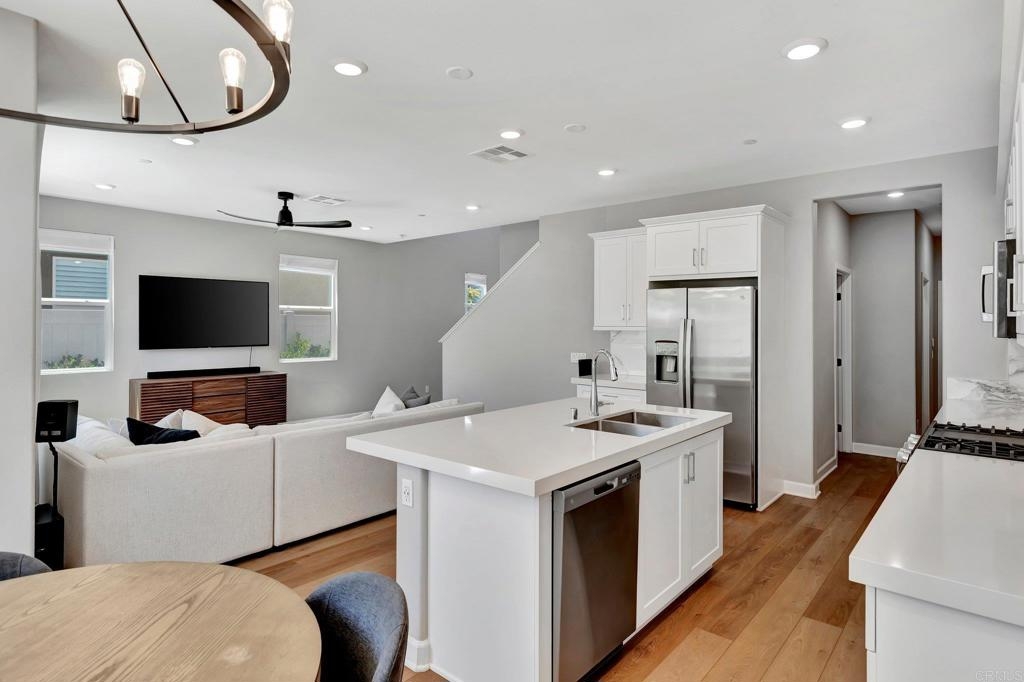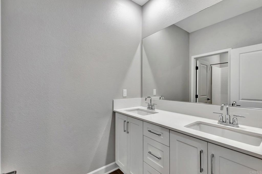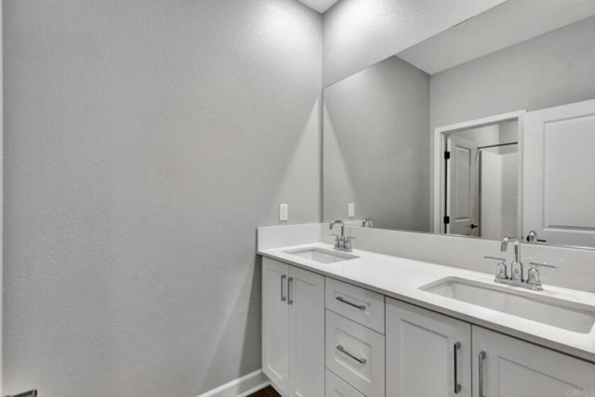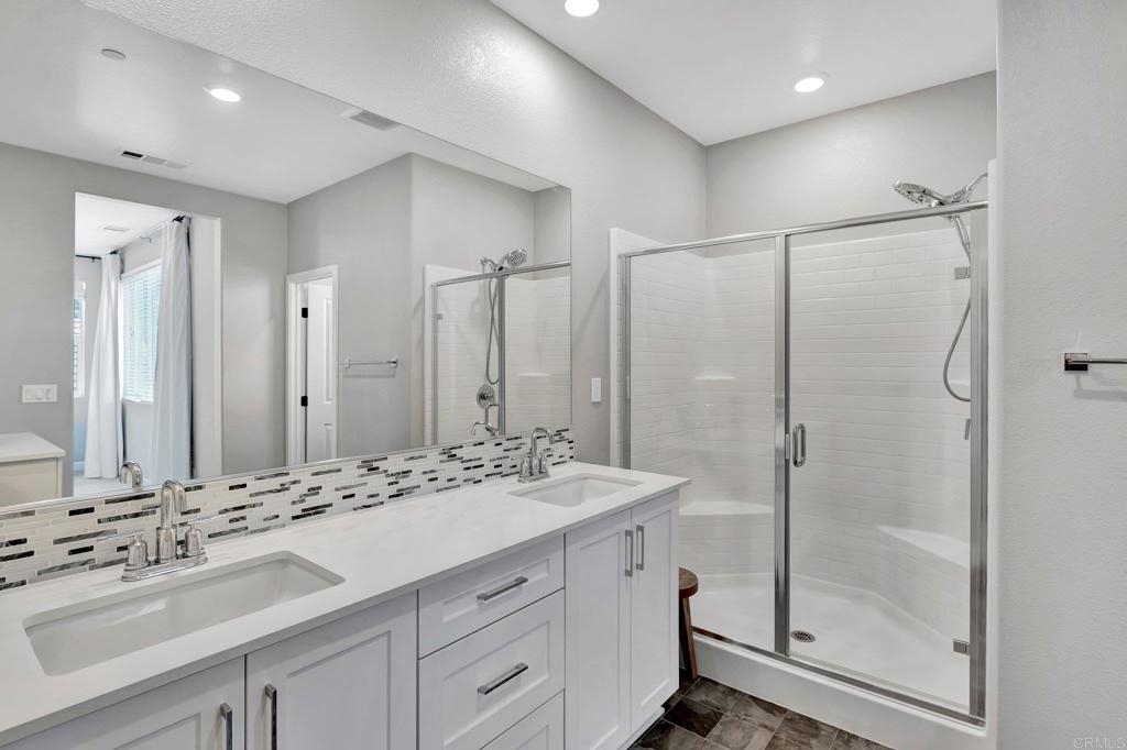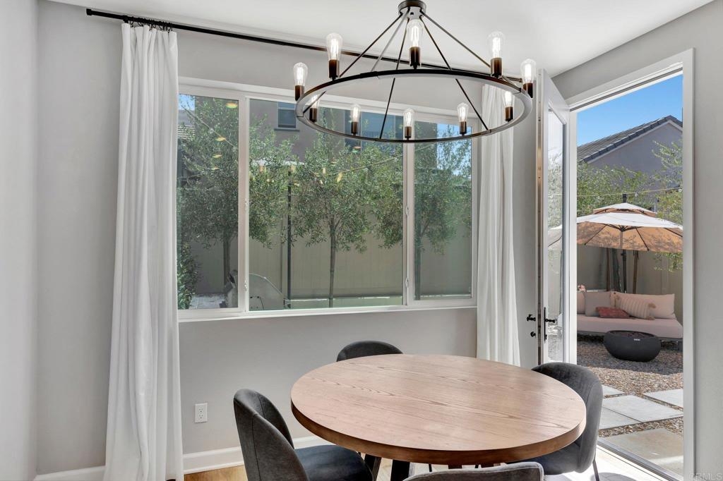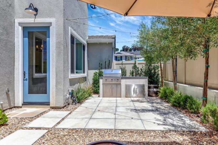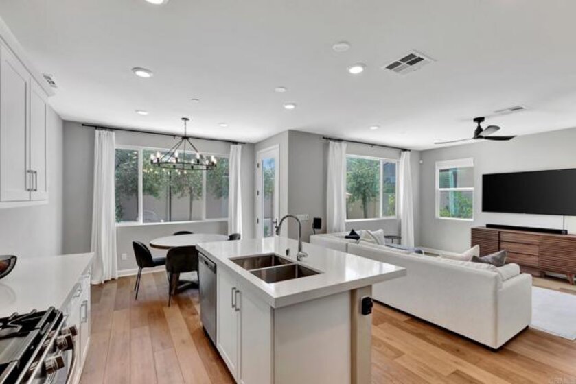 Pristine Retreat neighborhood home in newly developed Canopy Grove. Home features 4 bedrooms, 3 bathrooms, first level bedroom and full bathroom, upgraded flooring, quartz counters, solar, tankless water heater, and built-in barbeque. The kitchen features a quartz island w/ seating, quartz countertops w/ full tile backsplash, upgraded flooring, stainless steel appliances, pantry, pull out trash receptacles, and recessed lighting. The family room offers upgraded flooring, recessed lighting, a ceiling fan, and opens to the kitchen creating a large open living space. Adjacent to the kitchen, the breakfast area is enhanced w/ a chandelier and a glass door that leads to the backyard. The first level bedroom includes a ceiling fan and a walk in closet. The first level bathroom features upgraded flooring, a glass-enclosed walk-in shower, and recessed lights. The landing at top of stairs features a desk w/ seating area and lower storage cabinets, and recessed lights. The upstairs laundry room is equipped with upper storage cabinets, and an open shelf w/ a built-in hanging rack. The master bedroom is flooded w/ natural light from large windows and features recessed lighting. Its en-suite bathroom has dual sinks w/ upgraded backsplash, lower storage cabinets, a glass enclosed shower w/ dual seating area, and a walk-in closet w/ a mirrored door. The upstairs bedroom at the end of the hall features updated light fixtures on each side of the bed, closet w/ sliding doors, and a ceiling fan. The upstairs bathroom features dual sinks w/ backsplash, a large mirror, recessed lighting, and a shower/ tub combination. The fenced-in backyard showcases professionally designed drought-tolerant landscaping, concrete stepping stones leading to the side yard, cafe lights, and a built-in gas barbeque w/ counter space. The two-car garage includes ceiling racks and a tankless water heater. Welcome to Canopy Grove, a master-planned community in Escondido offering four unique neighborhoods that blend suburban charm with a vibrant community spirit. This development seamlessly integrates nature and outdoor living with cutting-edge home technologies, making it an ideal place to call home. Canopy Grove boasts an impressive array of amenities, including three beautiful parks, extensive walking paths, two enclosed pickleball courts, playgrounds, a half basketball court, a sand volleyball court, concrete ping pong tables, fresh drinking water stations, barbecues, dog parks, and picnic pavilions. The recreation center features a swimming pool, spa, fitness center, event lawn, and shower facilities. The barn-style recreation area serves as a lively hub for community activities and is available to the public. This space includes a gathering area with a kitchen, indoor and outdoor event spaces, a horseshoe area, restrooms, and an office, making it perfect for social events and community gatherings. Homes at Canopy Grove were originally designed with modern living in mind, featuring stainless steel appliances, quartz kitchen countertops, integrated home automation, and whole-home connectivity technology. Conveniently located just minutes from Interstate 15 and California State Highway 78, Canopy Grove offers easy access to all that Escondido has to offer.