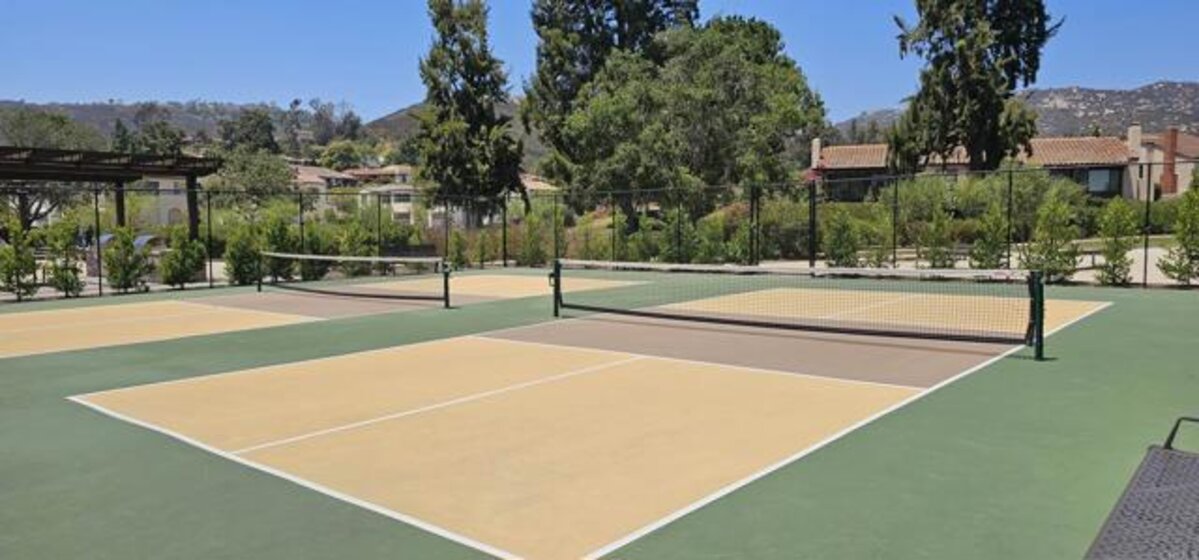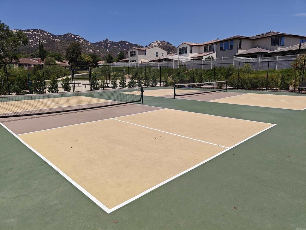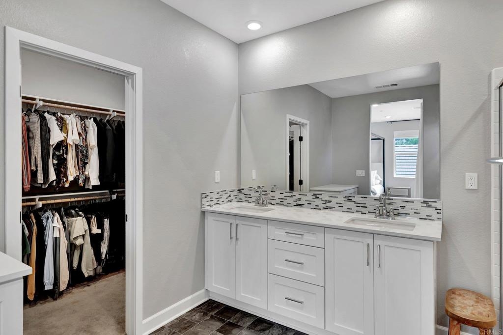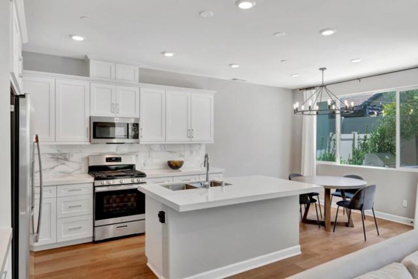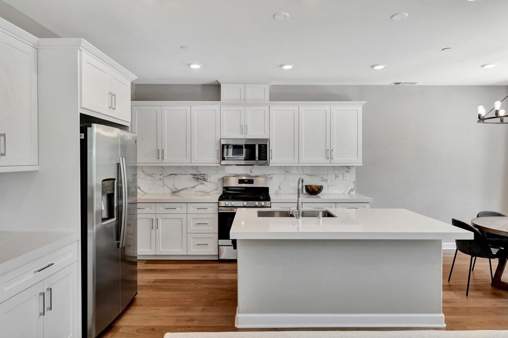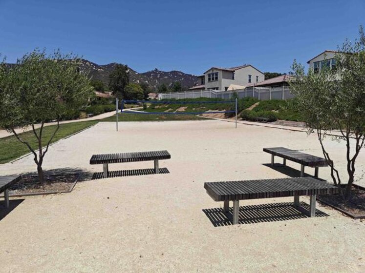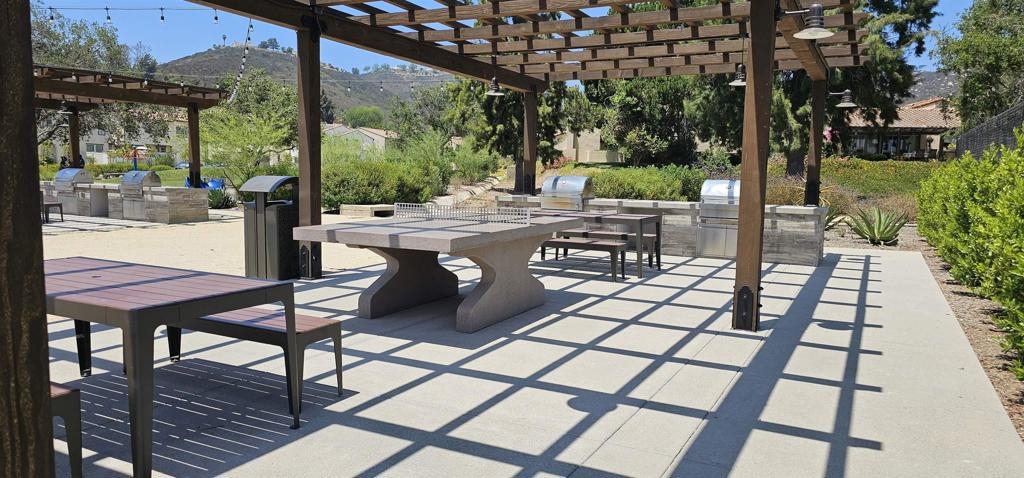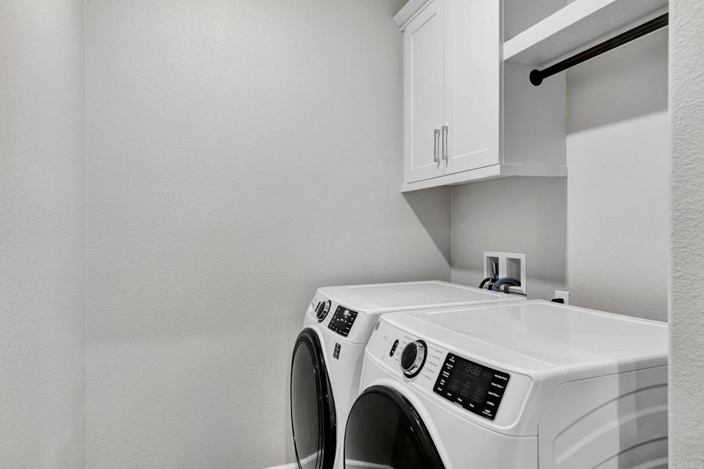 Pristine Retreat neighborhood home in newly developed Canopy Grove. Home features 4 bedrooms, 3 bathrooms, first level bedroom and full bathroom, upgraded flooring, quartz counters, solar, tankless water heater, and built-in barbeque. The kitchen features a quartz island w/ seating, quartz countertops w/ full tile backsplash, upgraded flooring, stainless steel appliances, pantry, pull out trash receptacles, and recessed lighting. The family room offers upgraded flooring, recessed lighting, a ceiling fan, and opens to the kitchen creating a large open living space. Adjacent to the kitchen, the breakfast area is enhanced w/ a chandelier and a glass door that leads to the backyard. The first level bedroom includes a ceiling fan and a walk in closet. The first level bathroom features upgraded flooring, a glass-enclosed walk-in shower, and recessed lights. The landing at top of stairs features a desk w/ seating area and lower storage cabinets, and recessed lights. The upstairs laundry room is equipped with upper storage cabinets, and an open shelf w/ a built-in hanging rack. The master bedroom is flooded w/ natural light from large windows and features recessed lighting. Its en-suite bathroom has dual sinks w/ upgraded backsplash, lower storage cabinets, a glass enclosed shower w/ dual seating area, and a walk-in closet w/ a mirrored door. The upstairs bedroom at the end of the hall features updated light fixtures on each side of the bed, closet w/ sliding doors, and a ceiling fan. The upstairs bathroom features dual sinks w/ backsplash, a large mirror, recessed lighting, and a shower/ tub combination. The fenced-in backyard showcases professionally designed drought-tolerant landscaping, concrete stepping stones leading to the side yard, cafe lights, and a built-in gas barbeque w/ counter space. The two-car garage includes ceiling racks and a tankless water heater. Welcome to Canopy Grove, a master-planned community in Escondido offering four unique neighborhoods that blend suburban charm with a vibrant community spirit. This development seamlessly integrates nature and outdoor living with cutting-edge home technologies, making it an ideal place to call home. Canopy Grove boasts an impressive array of amenities, including three beautiful parks, extensive walking paths, two enclosed pickleball courts, playgrounds, a half basketball court, a sand volleyball court, concrete ping pong tables, fresh drinking water stations, barbecues, dog parks, and picnic pavilions. The recreation center features a swimming pool, spa, fitness center, event lawn, and shower facilities. The barn-style recreation area serves as a lively hub for community activities and is available to the public. This space includes a gathering area with a kitchen, indoor and outdoor event spaces, a horseshoe area, restrooms, and an office, making it perfect for social events and community gatherings. Homes at Canopy Grove were originally designed with modern living in mind, featuring stainless steel appliances, quartz kitchen countertops, integrated home automation, and whole-home connectivity technology. Conveniently located just minutes from Interstate 15 and California State Highway 78, Canopy Grove offers easy access to all that Escondido has to offer.