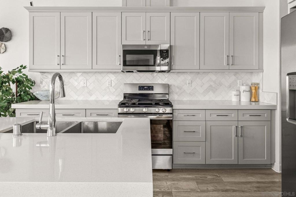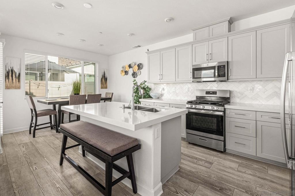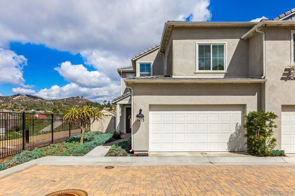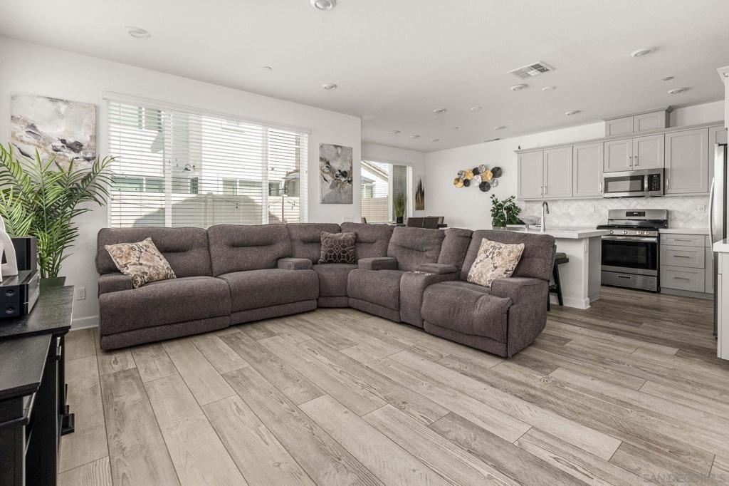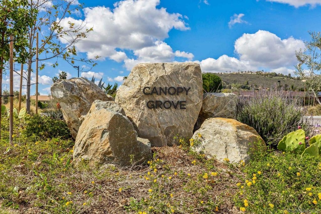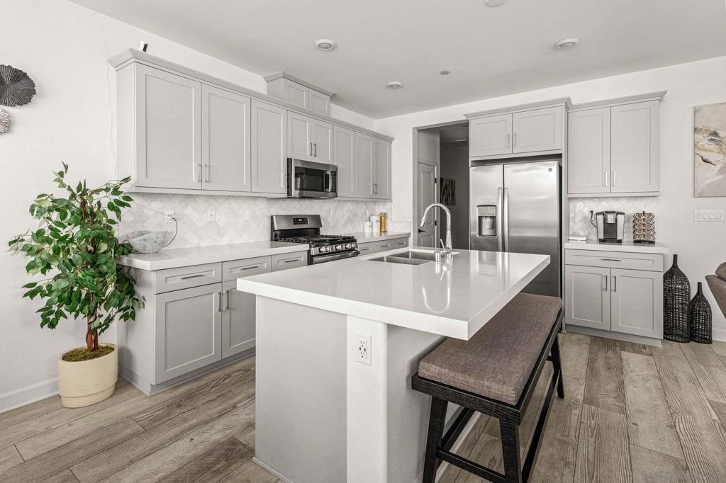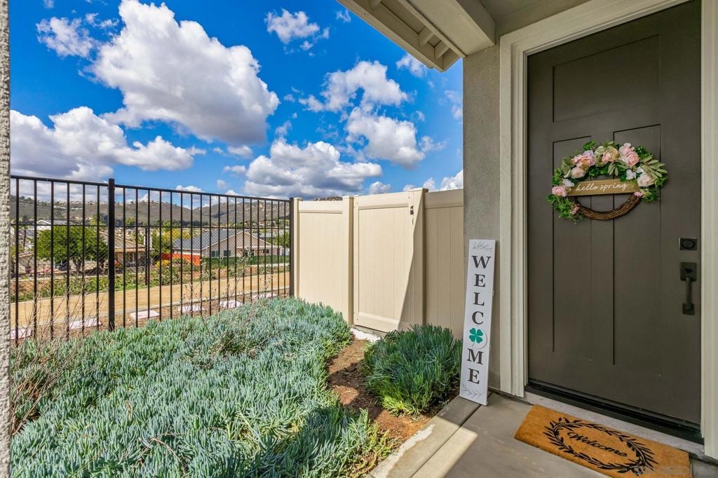 Located in the sought-after Canopy Grove community in North Escondido, this modern 2021-built home offers a prime location with only one shared wall and a neighbor on one side, while enjoying open space and recreational trails on the other. The open floor plan features LVP flooring on the main level, a main-floor bedroom and bath, and a beautifully designed kitchen with soft grey shaker-style cabinetry, quartz countertops, a custom tile backsplash, recessed lighting, and an island with breakfast counter seating that seamlessly connects to the living area. The spacious primary suite boasts a walk-in closet and a private en-suite bath, while the private yard offers low-maintenance landscaping for easy outdoor enjoyment. Additional features include a leased solar system and an attached two-car garage. Canopy Grove’s resort-style amenities include a pool, clubhouse, gym, multiple parks, tennis and pickleball courts, recreational trails, and a dog park. Conveniently located near shopping, dining, parks, and Interstate 15, this home provides the perfect blend of comfort, style, and accessibility.