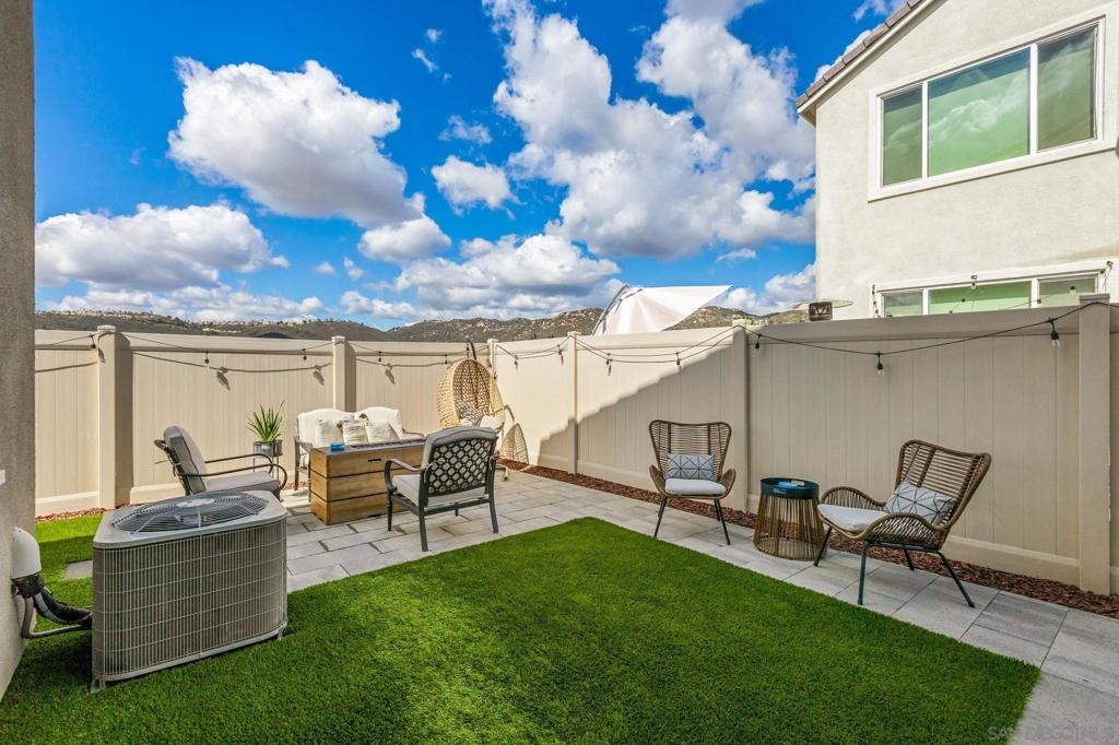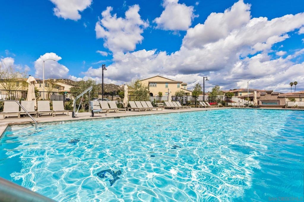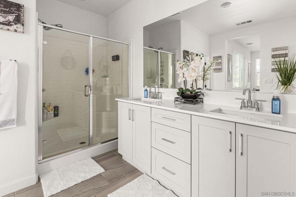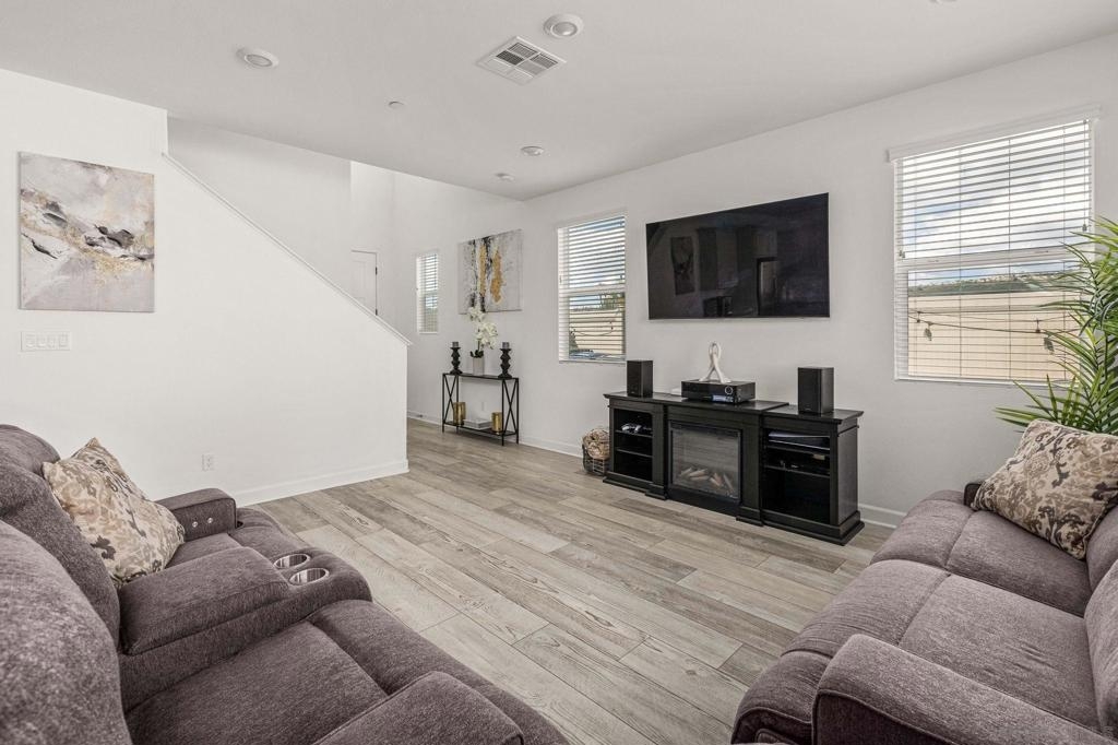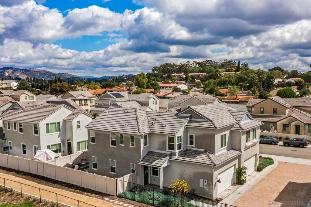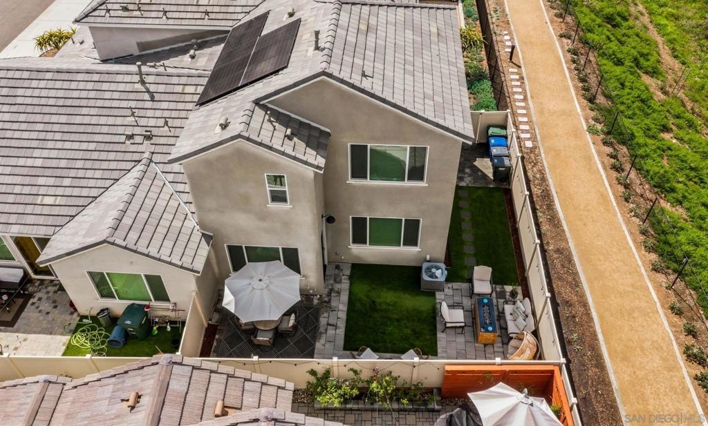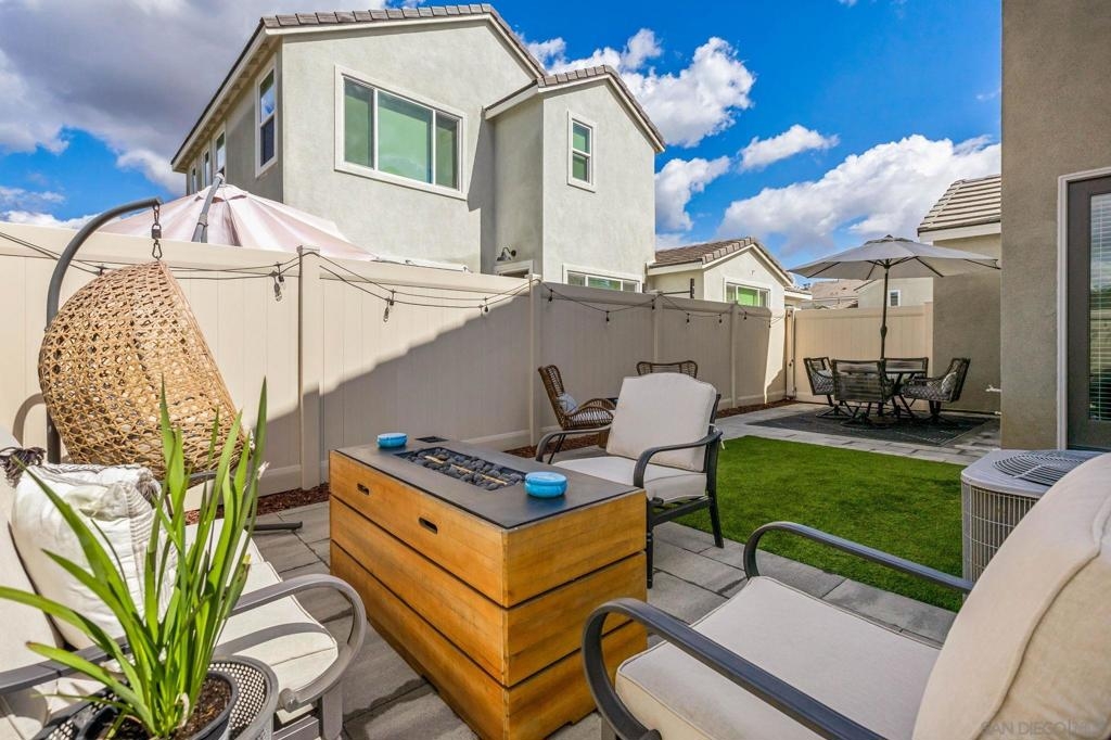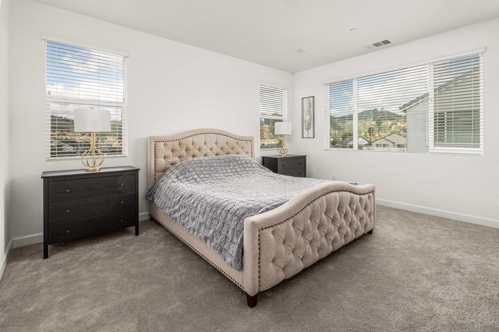Located in the sought-after Canopy Grove community in North Escondido, this modern 2021-built home offers a prime location with only one shared wall and a neighbor on one side, while enjoying open space and recreational trails on the other. The open floor plan features LVP flooring on the main level, a main-floor bedroom and bath, and a beautifully designed kitchen with soft grey shaker-style cabinetry, quartz countertops, a custom tile backsplash, recessed lighting, and an island with breakfast counter seating that seamlessly connects to the living area. The spacious primary suite boasts a walk-in closet and a private en-suite bath, while the private yard offers low-maintenance landscaping for easy outdoor enjoyment. Additional features include a leased solar system and an attached two-car garage. Canopy Grove’s resort-style amenities include a pool, clubhouse, gym, multiple parks, tennis and pickleball courts, recreational trails, and a dog park. Conveniently located near shopping, dining, parks, and Interstate 15, this home provides the perfect blend of comfort, style, and accessibility.