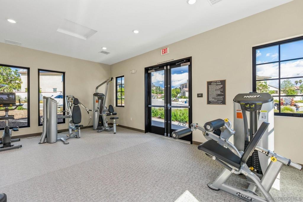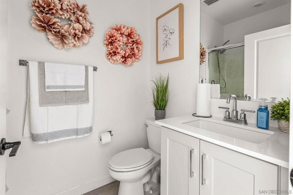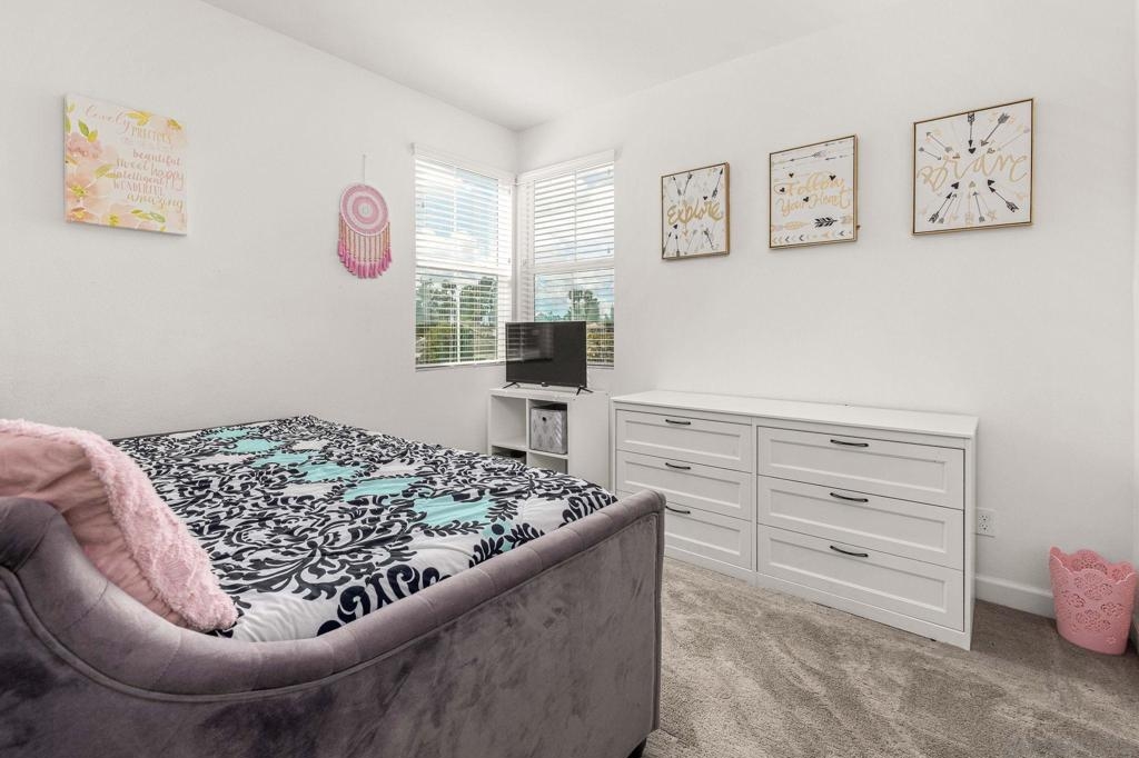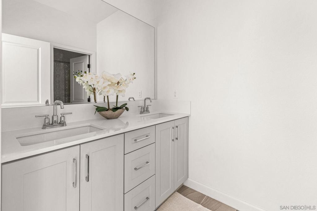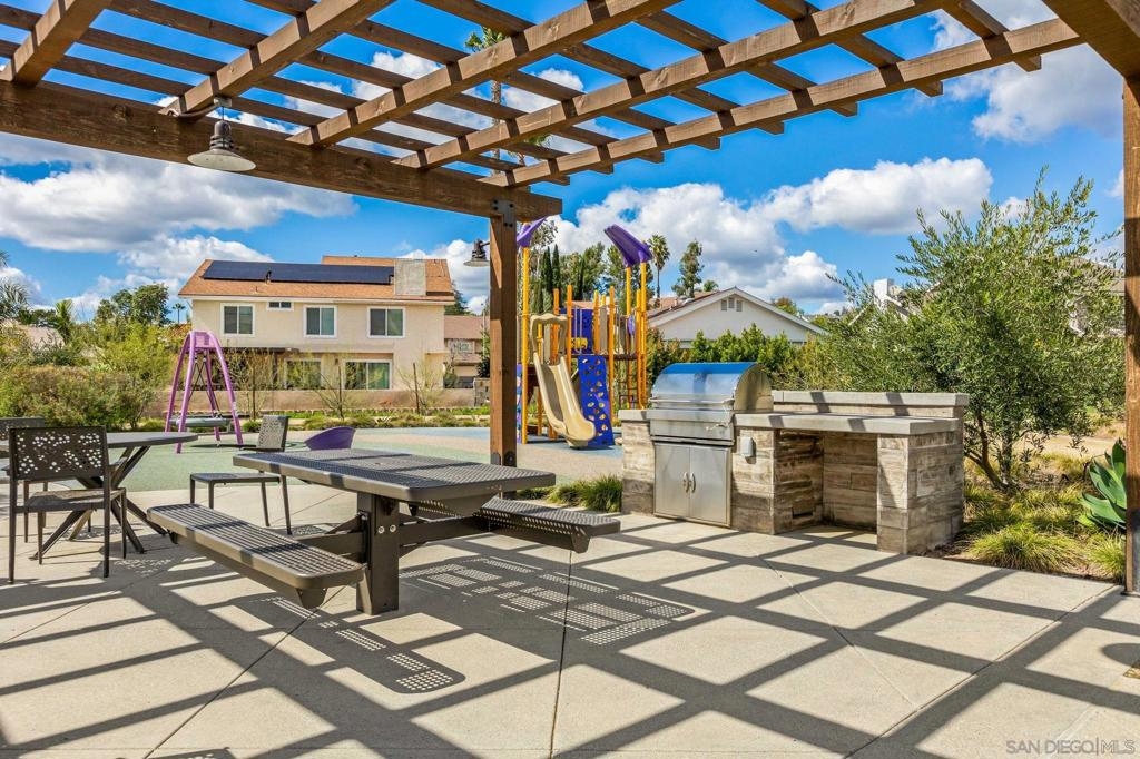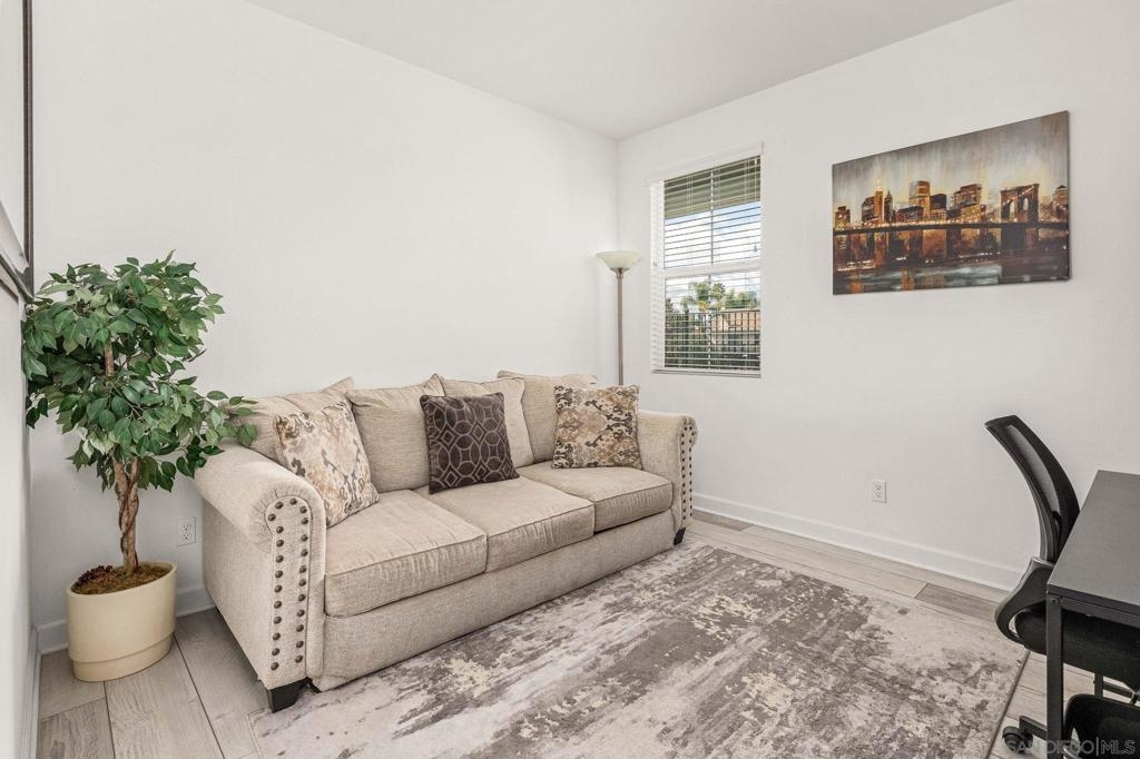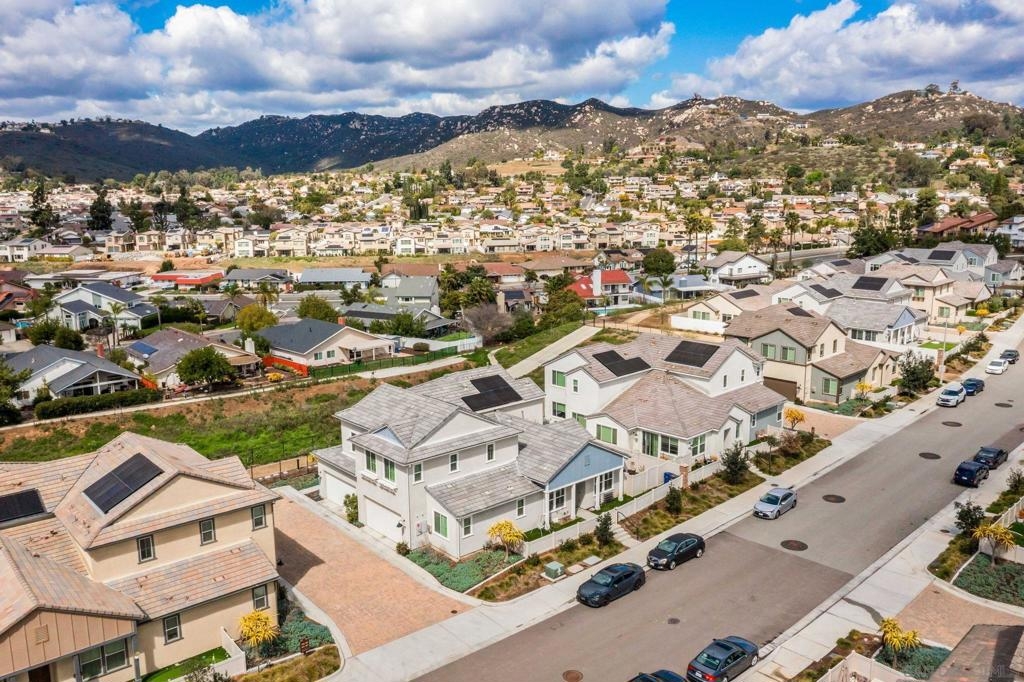 Located in the sought-after Canopy Grove community in North Escondido, this modern 2021-built home offers a prime location with only one shared wall and a neighbor on one side, while enjoying open space and recreational trails on the other. The open floor plan features LVP flooring on the main level, a main-floor bedroom and bath, and a beautifully designed kitchen with soft grey shaker-style cabinetry, quartz countertops, a custom tile backsplash, recessed lighting, and an island with breakfast counter seating that seamlessly connects to the living area. The spacious primary suite boasts a walk-in closet and a private en-suite bath, while the private yard offers low-maintenance landscaping for easy outdoor enjoyment. Additional features include a leased solar system and an attached two-car garage. Canopy Grove’s resort-style amenities include a pool, clubhouse, gym, multiple parks, tennis and pickleball courts, recreational trails, and a dog park. Conveniently located near shopping, dining, parks, and Interstate 15, this home provides the perfect blend of comfort, style, and accessibility.