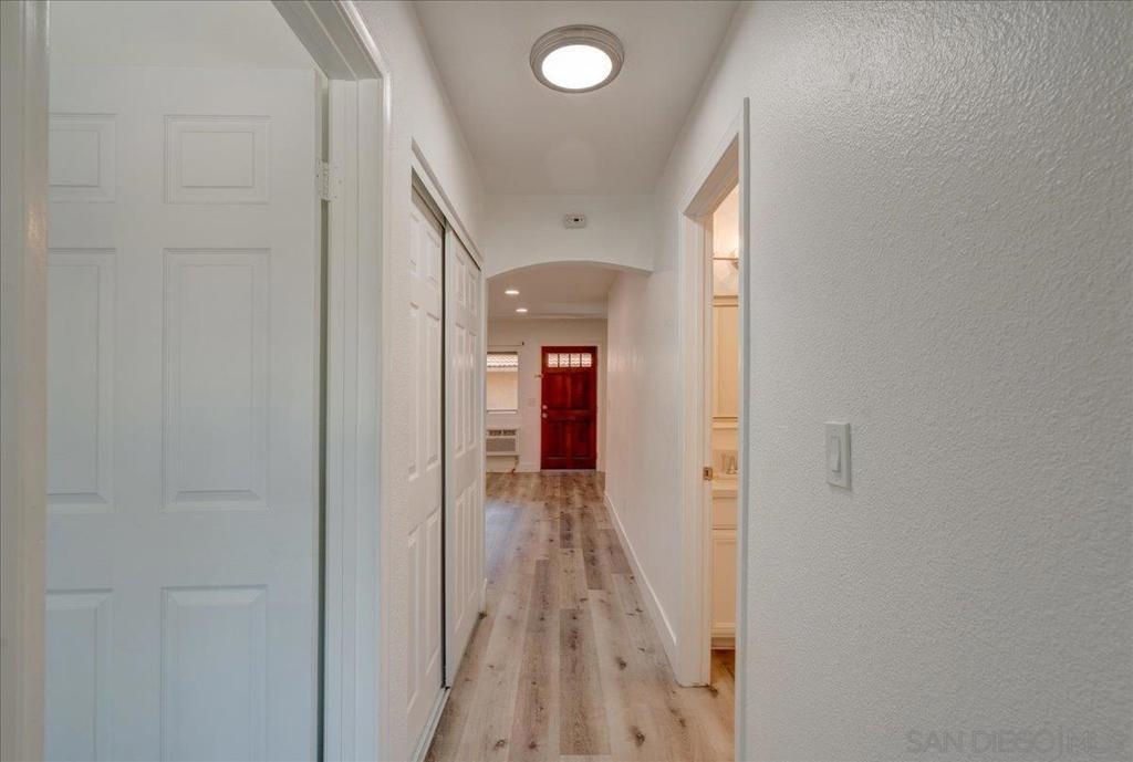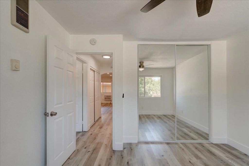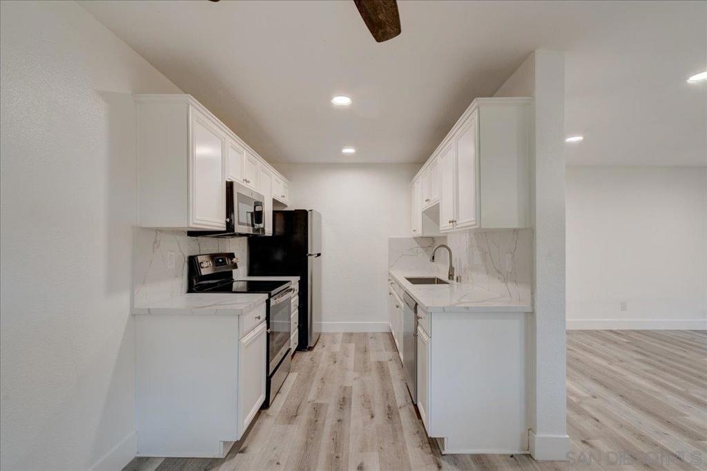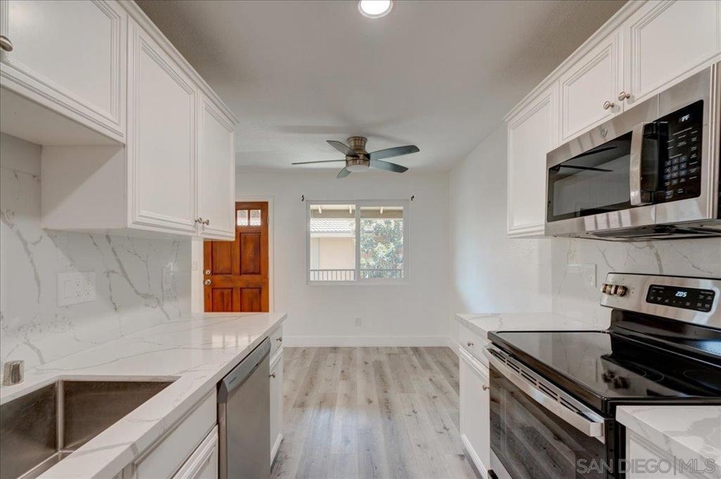 VA Approved Complex! Upstairs unit with upgraded kitchen, stainless steel appliances, and quartz countertops with full backsplash. The kitchen has a dishwasher, refrigerator, and range/oven. Newer laminate wood flooring throughout. Large living room with A/C wall unit and upgraded bathroom. Recessed lighting in the living room. Ceiling fans in the dining room and bedrooms. Large primary bedroom master closet. New windows are throughout, and there is a private one-car garage. The community has two pools, a clubhouse, and a laundry facility.