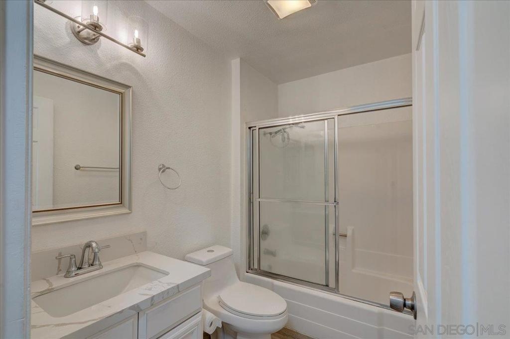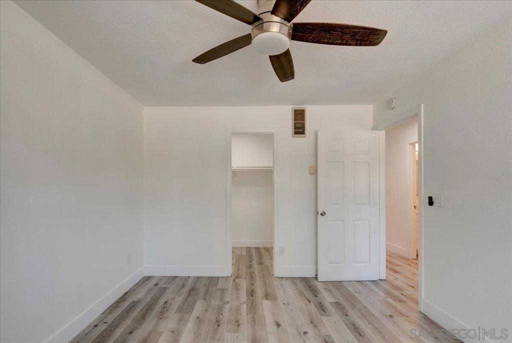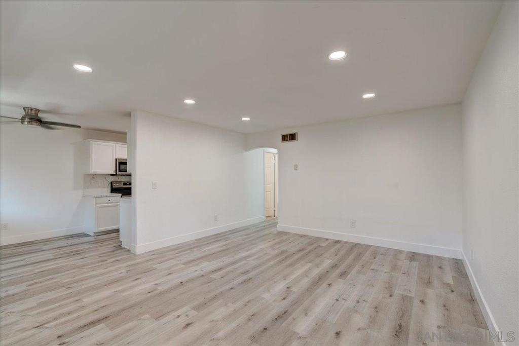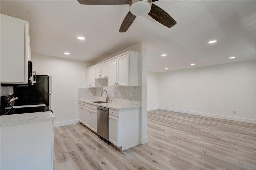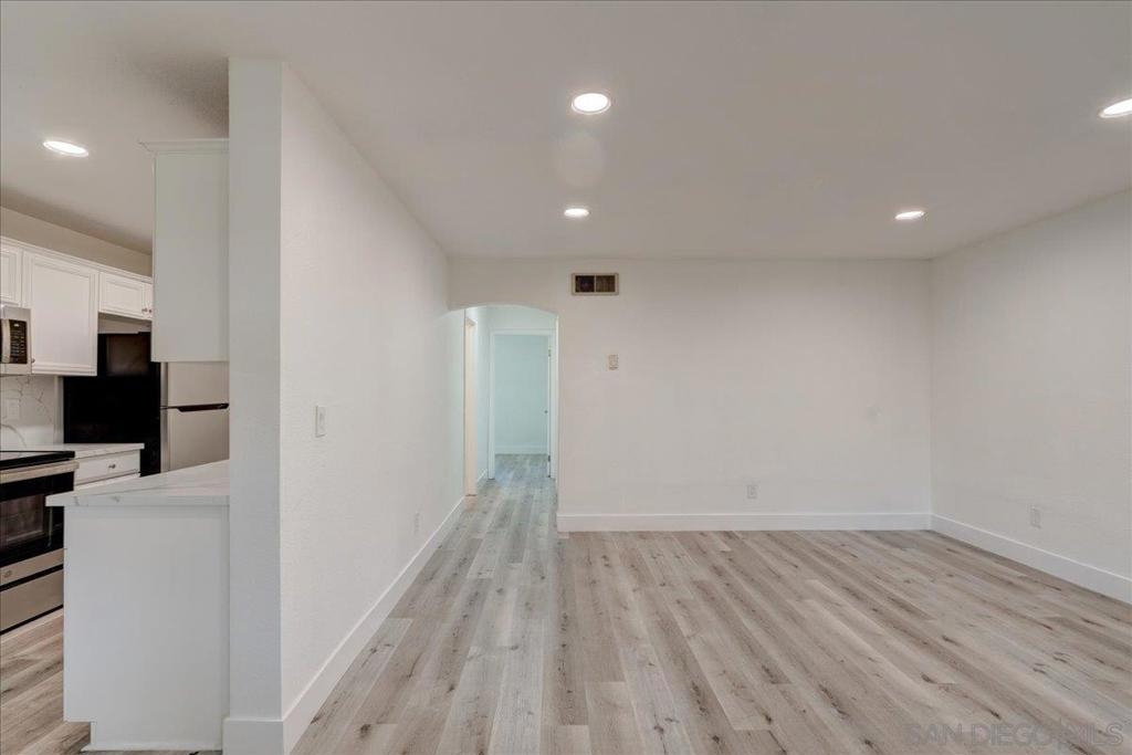VA Approved Complex! Upstairs unit with upgraded kitchen, stainless steel appliances, and quartz countertops with full backsplash. The kitchen has a dishwasher, refrigerator, and range/oven. Newer laminate wood flooring throughout. Large living room with A/C wall unit and upgraded bathroom. Recessed lighting in the living room. Ceiling fans in the dining room and bedrooms. Large primary bedroom master closet. New windows are throughout, and there is a private one-car garage. The community has two pools, a clubhouse, and a laundry facility.