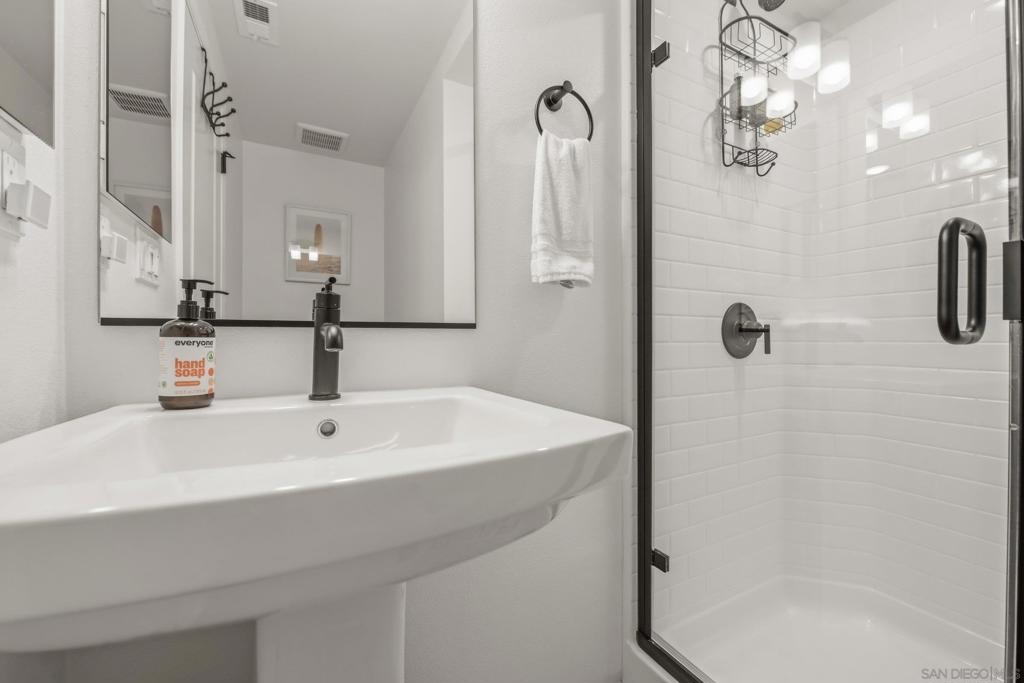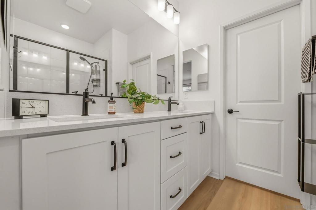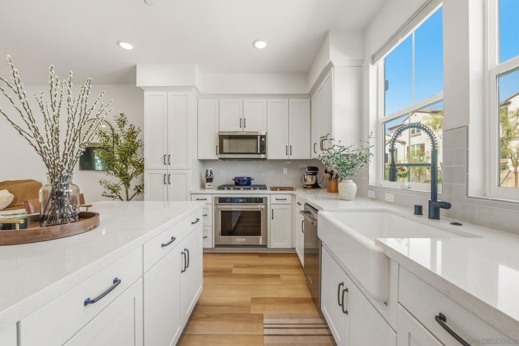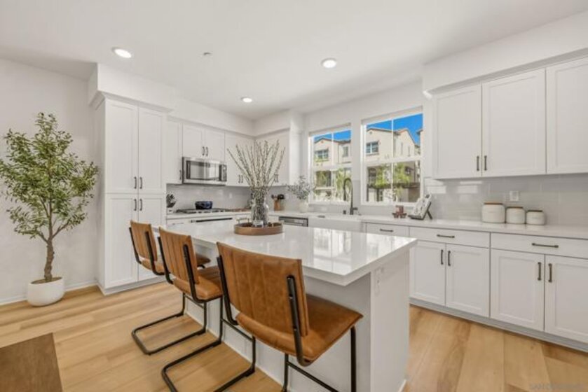 Welcome to 433 Jupiter Gln in Escondido’s desirable Eclipse community. Built in 2023, this contemporary tri-level townhome offers a flexible modern layout with stylish upgrades throughout. The entry, kitchen, living, dining, and baths feature upgraded vinyl plank flooring, while premium carpet, recessed lighting, and upgraded stair lighting add warmth and comfort throughout the home. The chef’s kitchen is beautifully appointed with soft-close cabinetry, subway tile backsplash, bronze hardware, and KitchenAid appliances including a 5-burner gas cooktop, separate oven, microwave, and dishwasher. The spacious primary suite features recessed lighting, a walk-in closet with mirrored door, dual medicine cabinets, upgraded shower tile. Additional highlights include upgraded doors, hardware, and an included washer and dryer. Eclipse residents enjoy a pool, spa, BBQ area, lounge space, and playground near downtown Escondido, shopping, dining, and convenient freeway access.