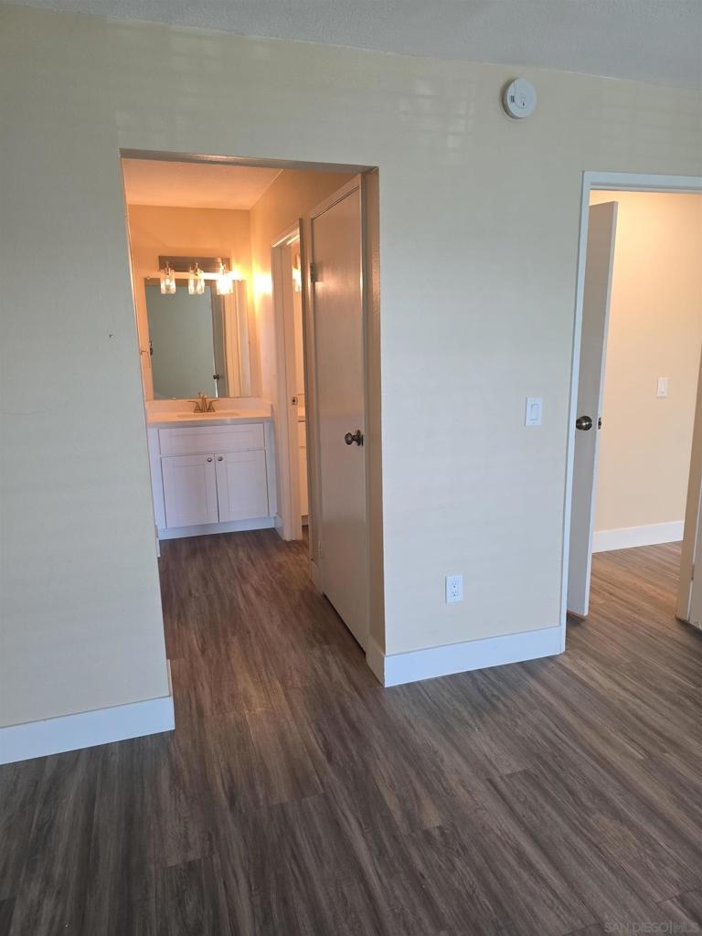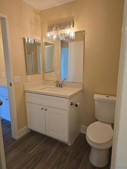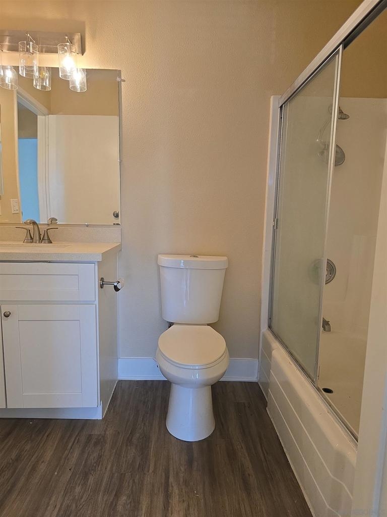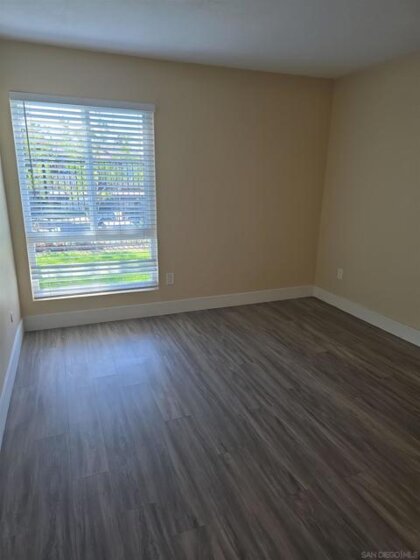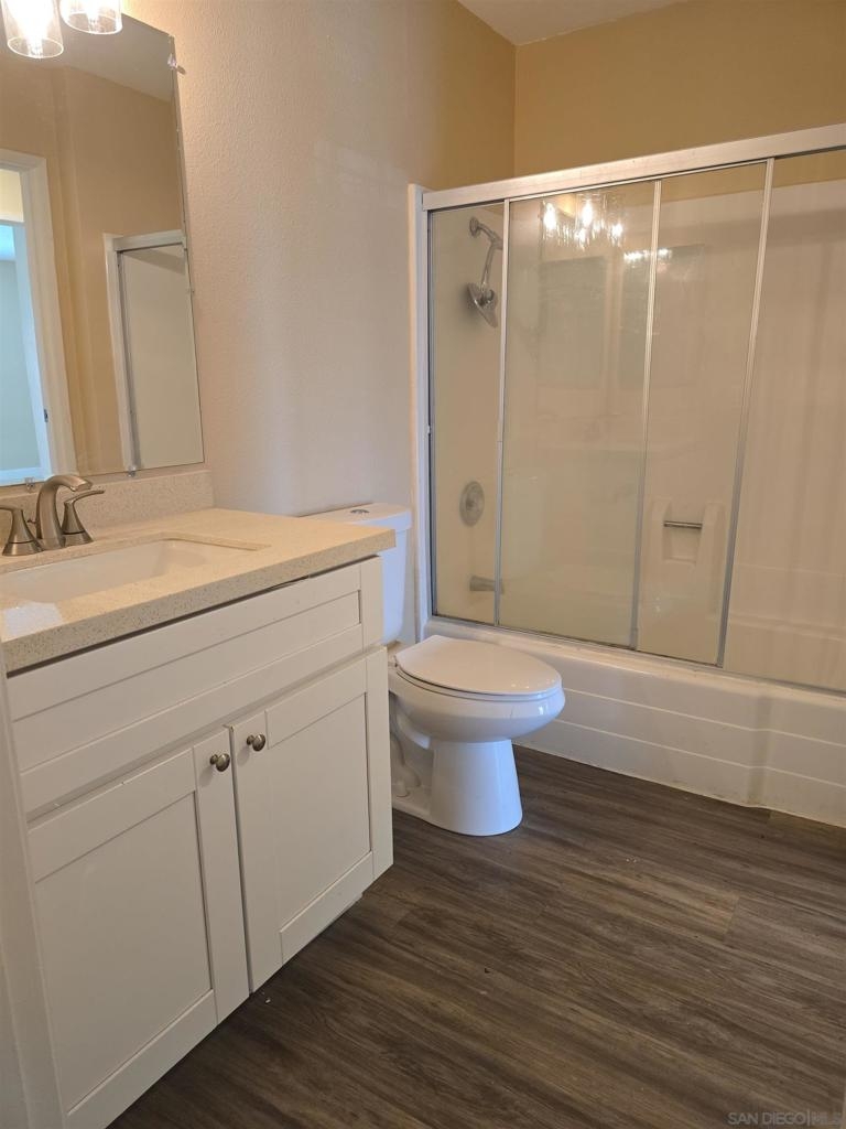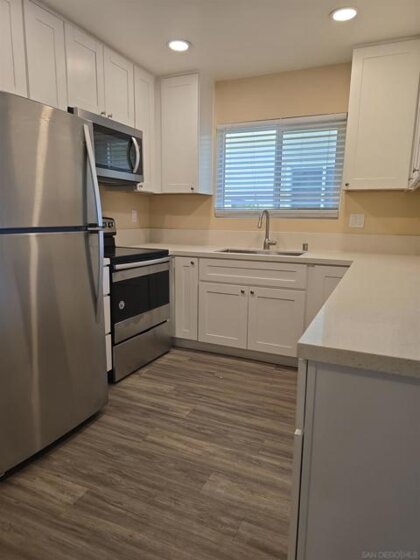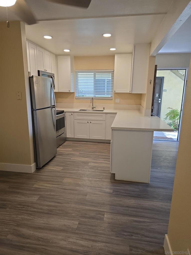 Beautifully updated first-floor unit featuring modern finishes and a functional open layout. The upgraded kitchen offers white shaker cabinetry, light quartz countertops, stainless steel appliances, recessed lighting, and a convenient peninsula for additional seating. Living and dining areas flow seamlessly with wood laminate flooring throughout and abundant natural light from the sliding glass door leading to a private patio, which includes a dedicated laundry closet with hookups for added convenience. The unit offers two well-sized bedrooms with mirrored closet doors, including a spacious primary bedroom with an additional closet and a separate vanity area. The bathroom features updated cabinetry, matching quartz countertops, and updated vanity lighting, along with a versatile Jack-and-Jill layout accessible from both the hallway and primary bedroom. Additional highlights include dual-pane windows, a ceiling fan in the dining area, and a dining area storage closet with custom built-in shelving, providing excellent organization and functionality. The unit includes one assigned parking space (#109) plus an additional permitted parking option and is located in a well-maintained community with greenbelt views, making this move-in-ready home ideal for both homeowners and investors alike.